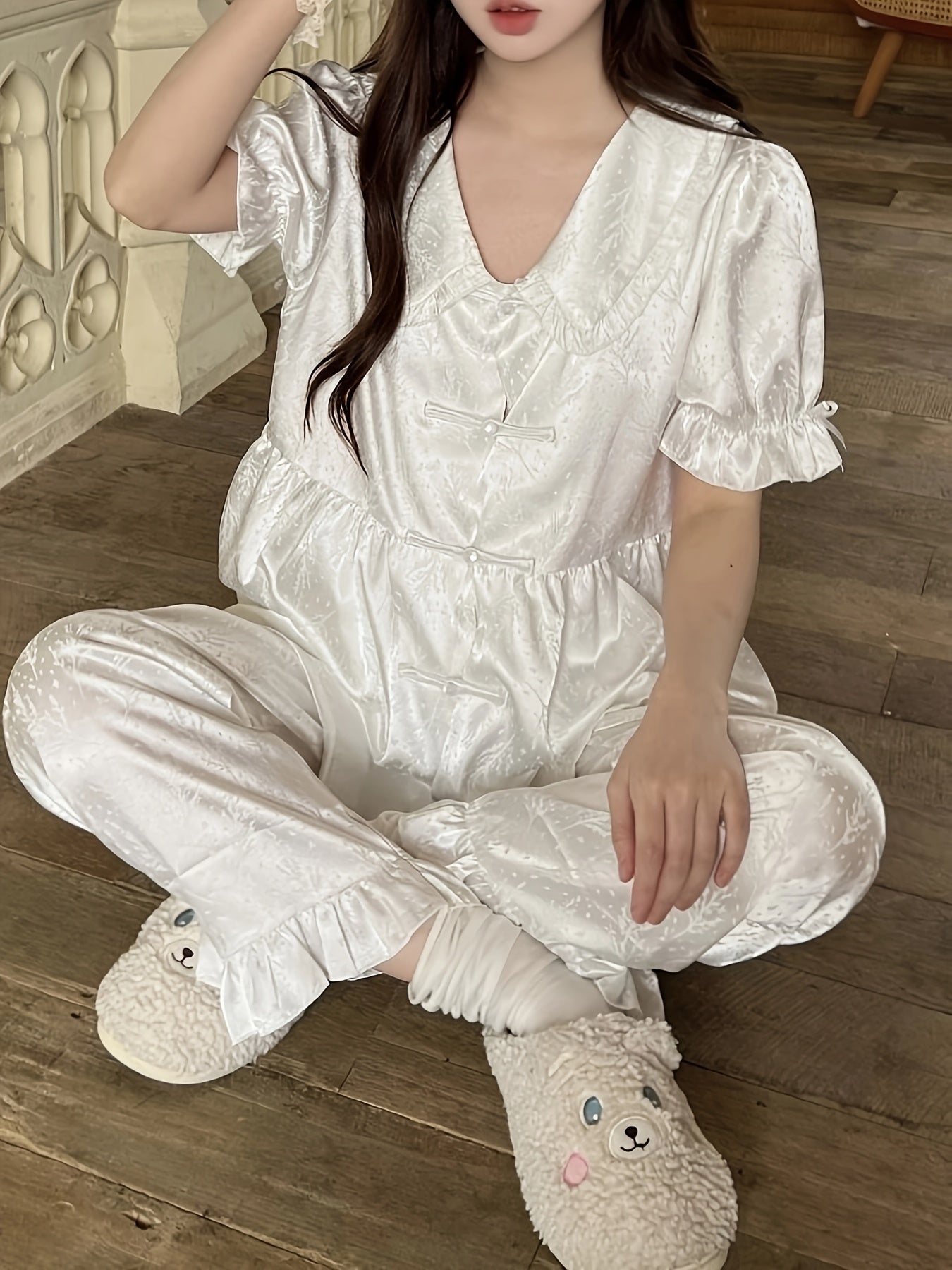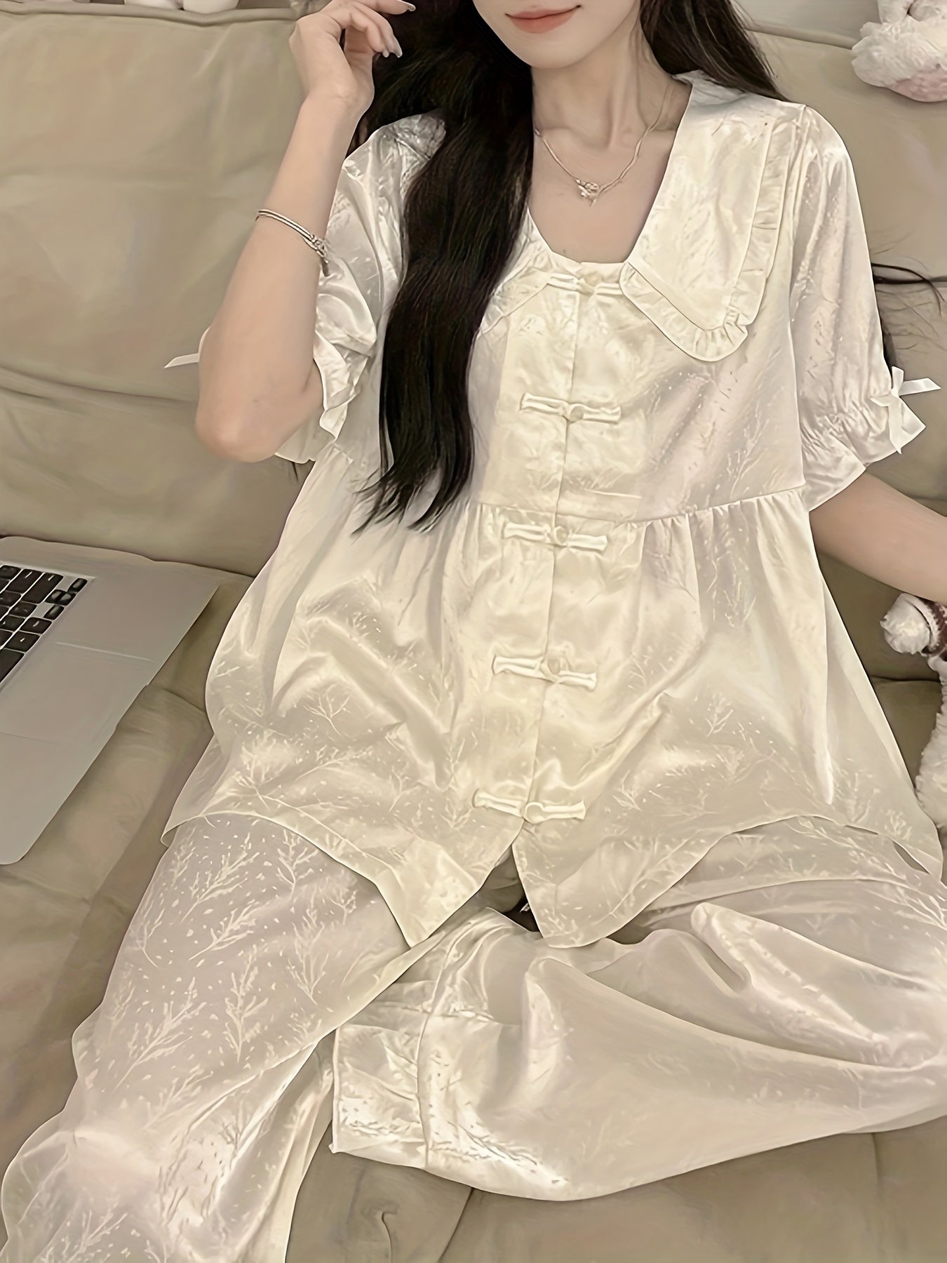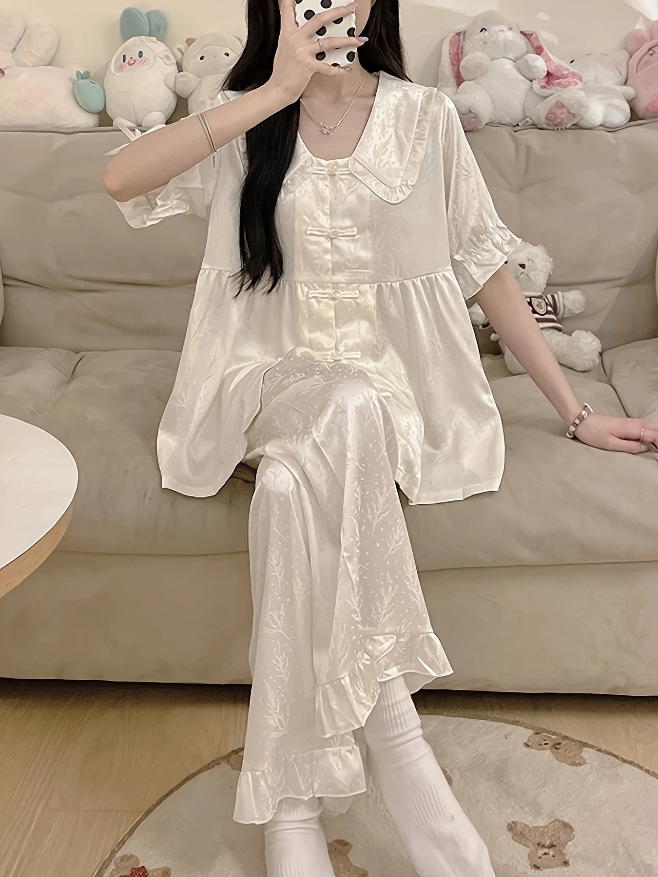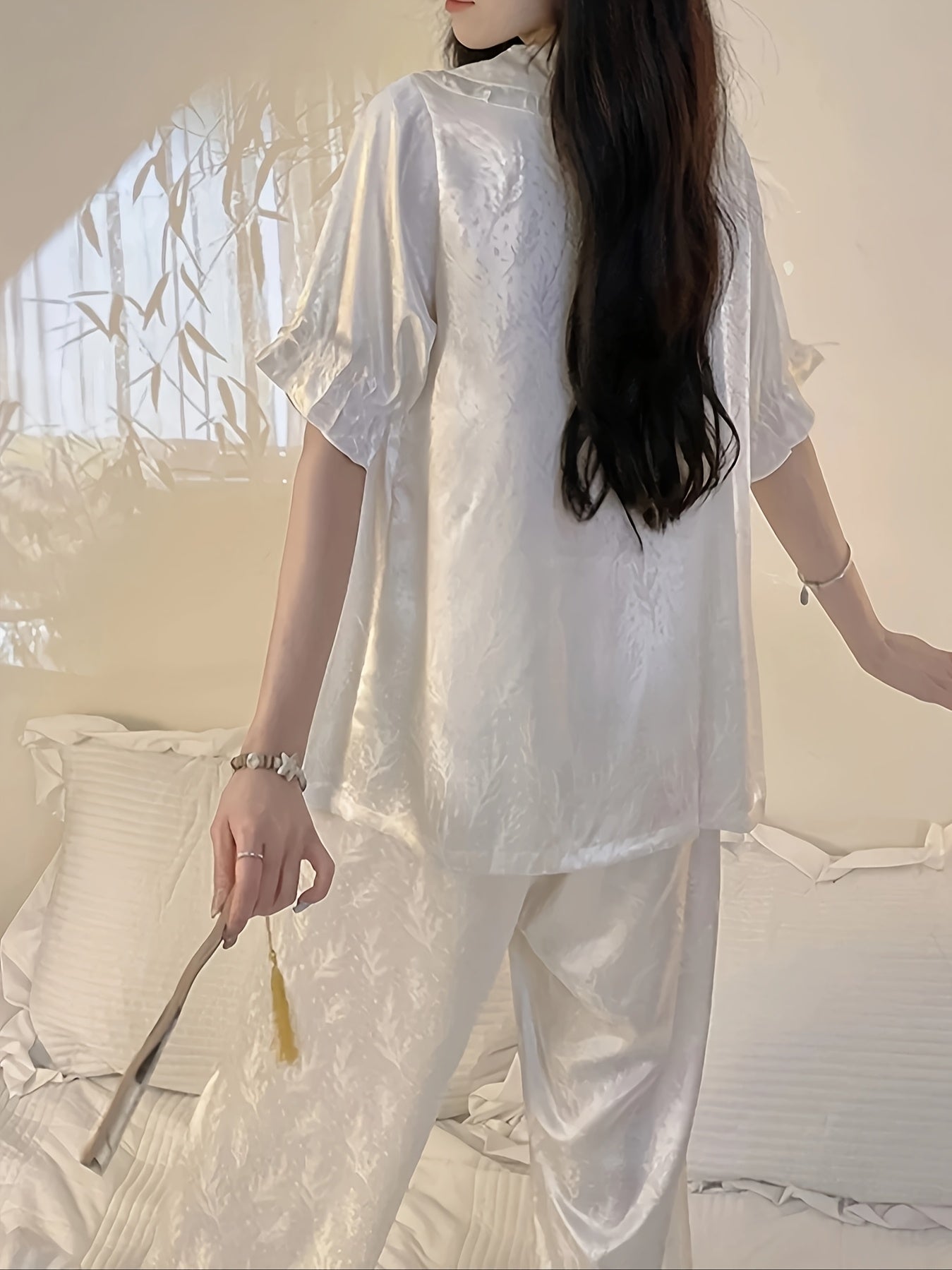 2025 New Chinese Style Summer Pajamas for Women: Ice Sliky Fiber Fabric Short-Sleeve Collar Court Lace Sweet Luxury Home Wear