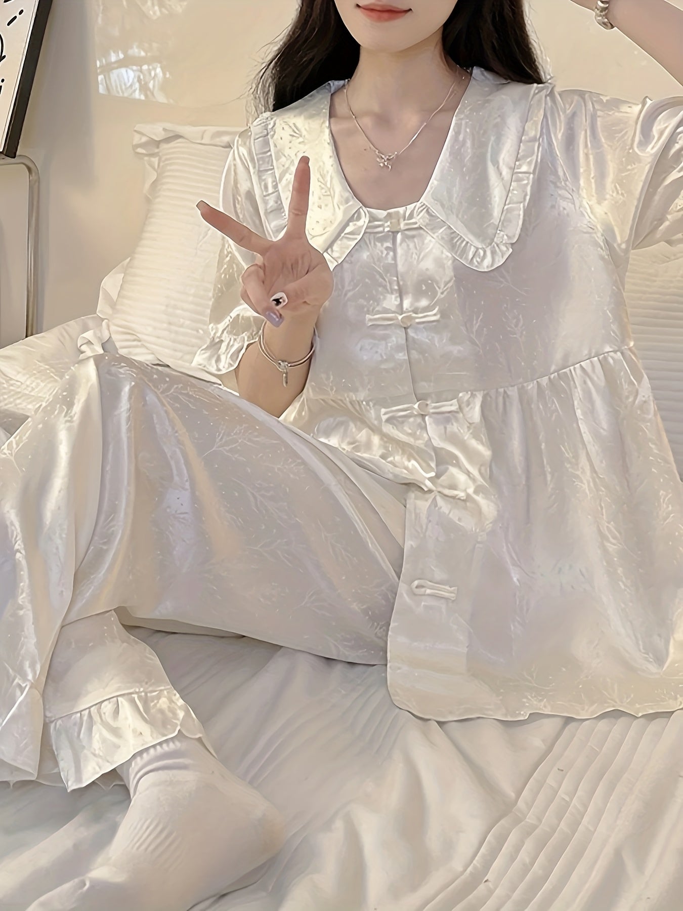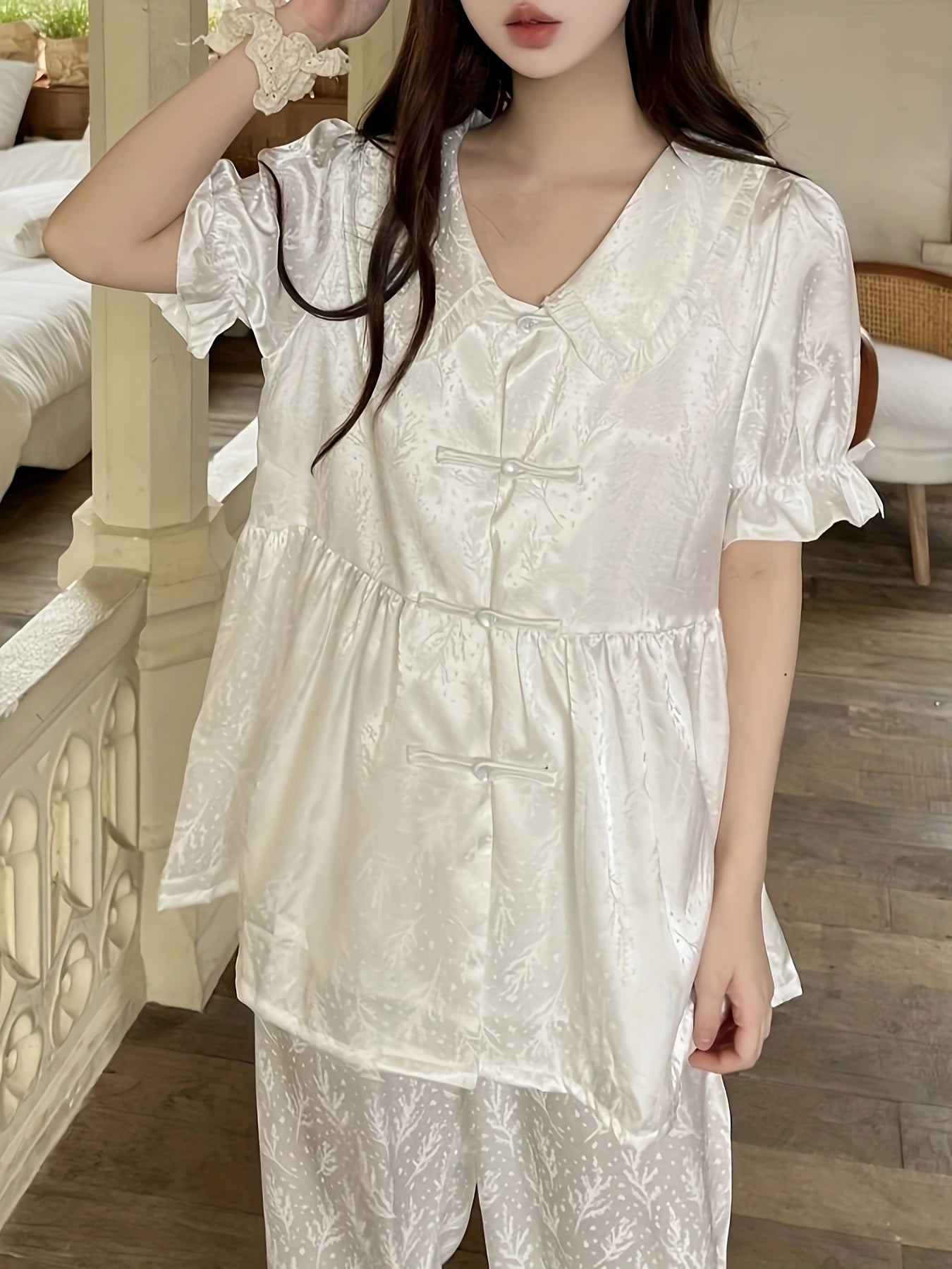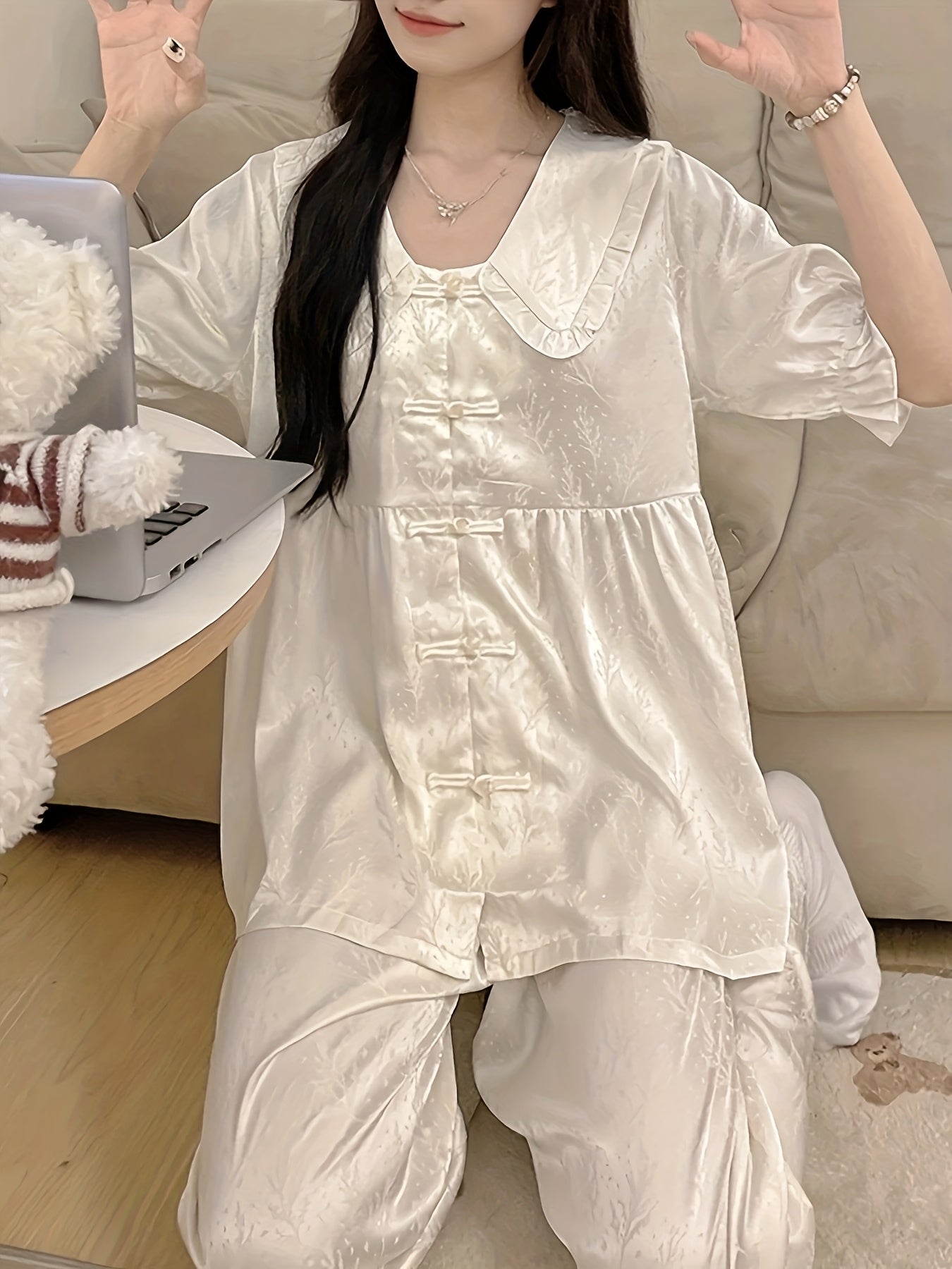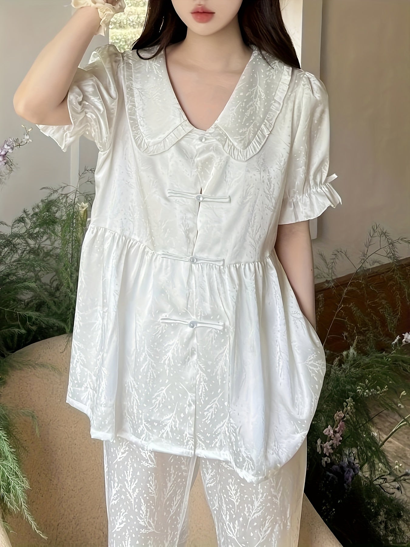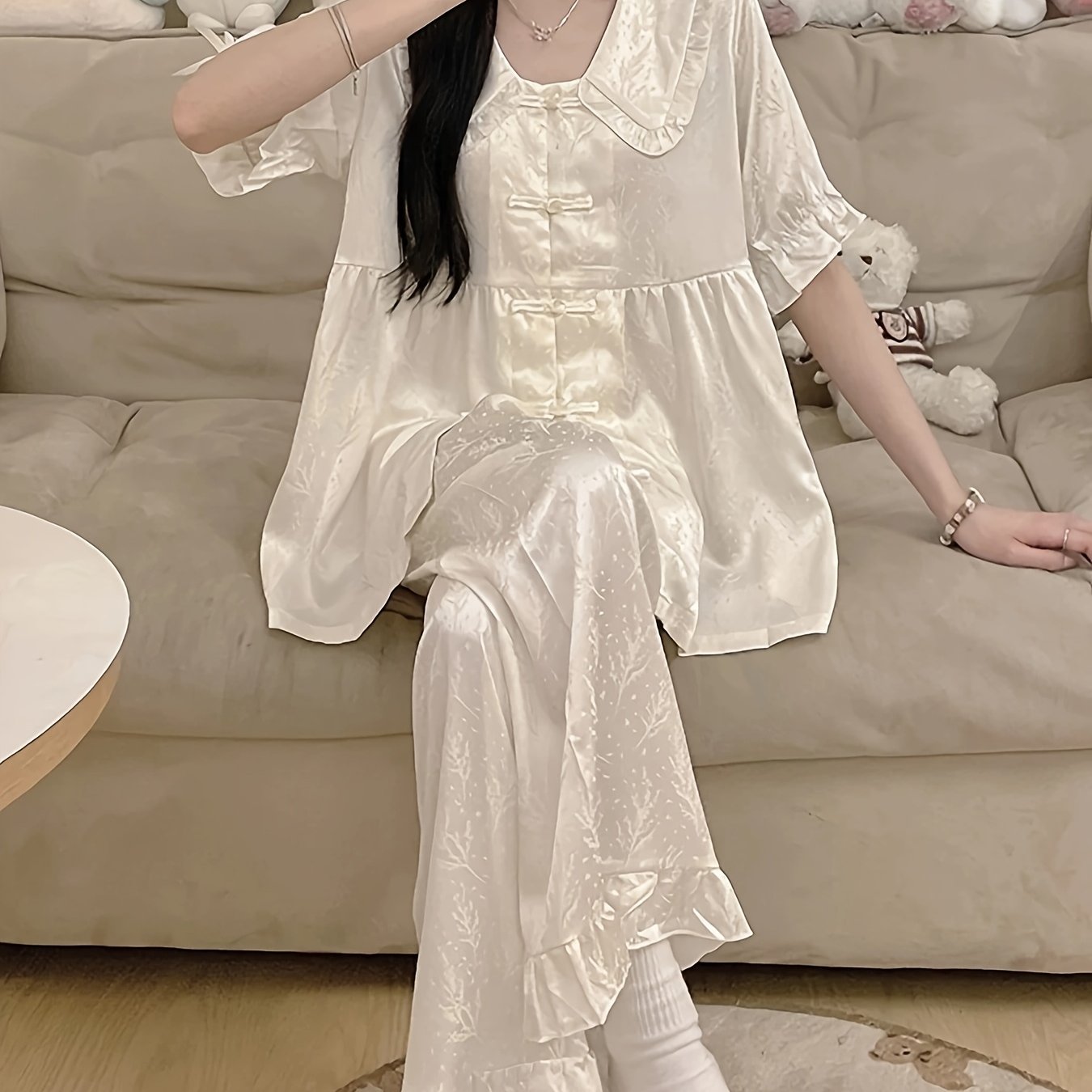 2025 New Chinese Style Summer Pajamas for Women: Ice Sliky Fiber Fabric Short-Sleeve Collar Court Lace Sweet Luxury Home Wear