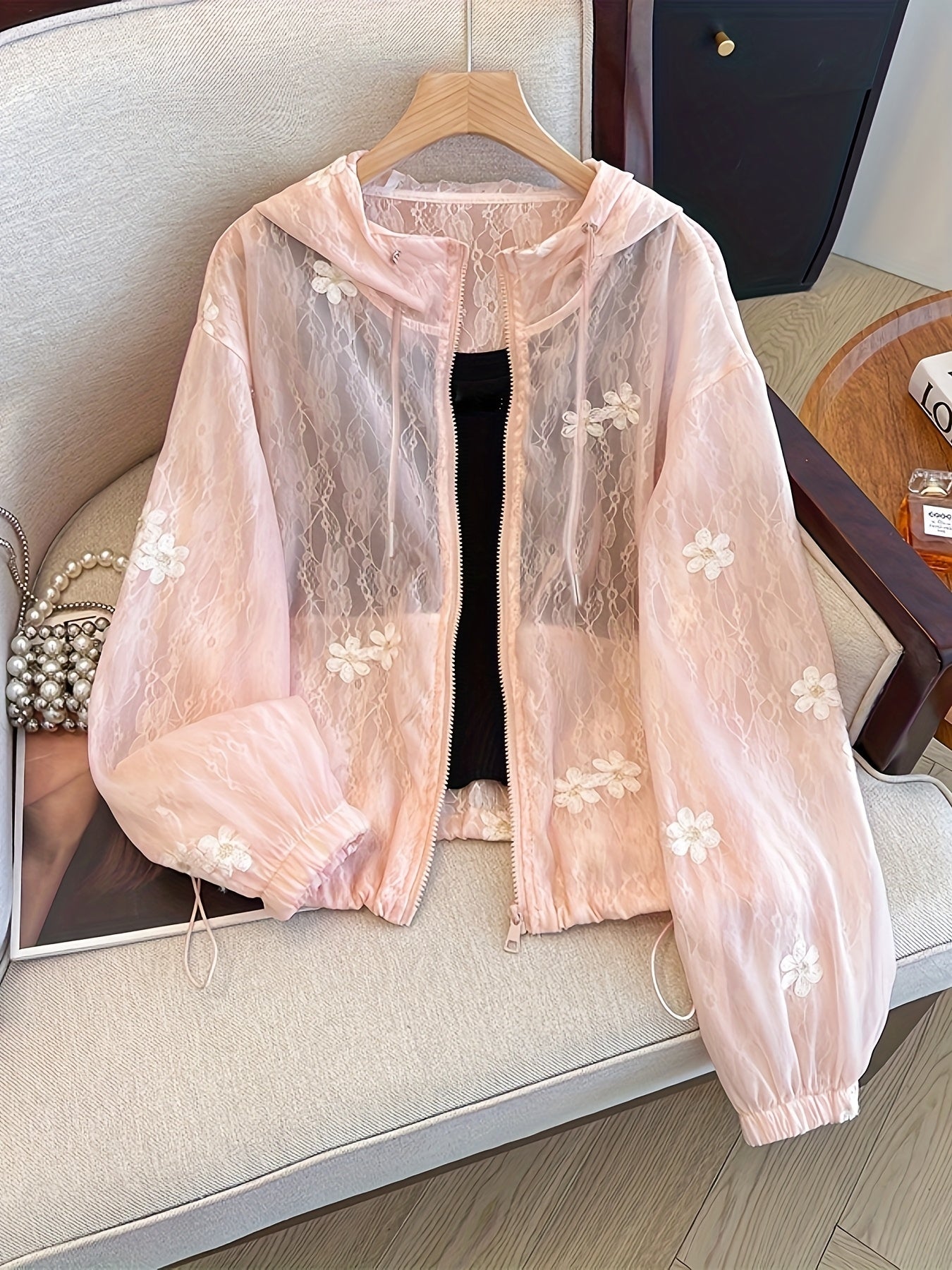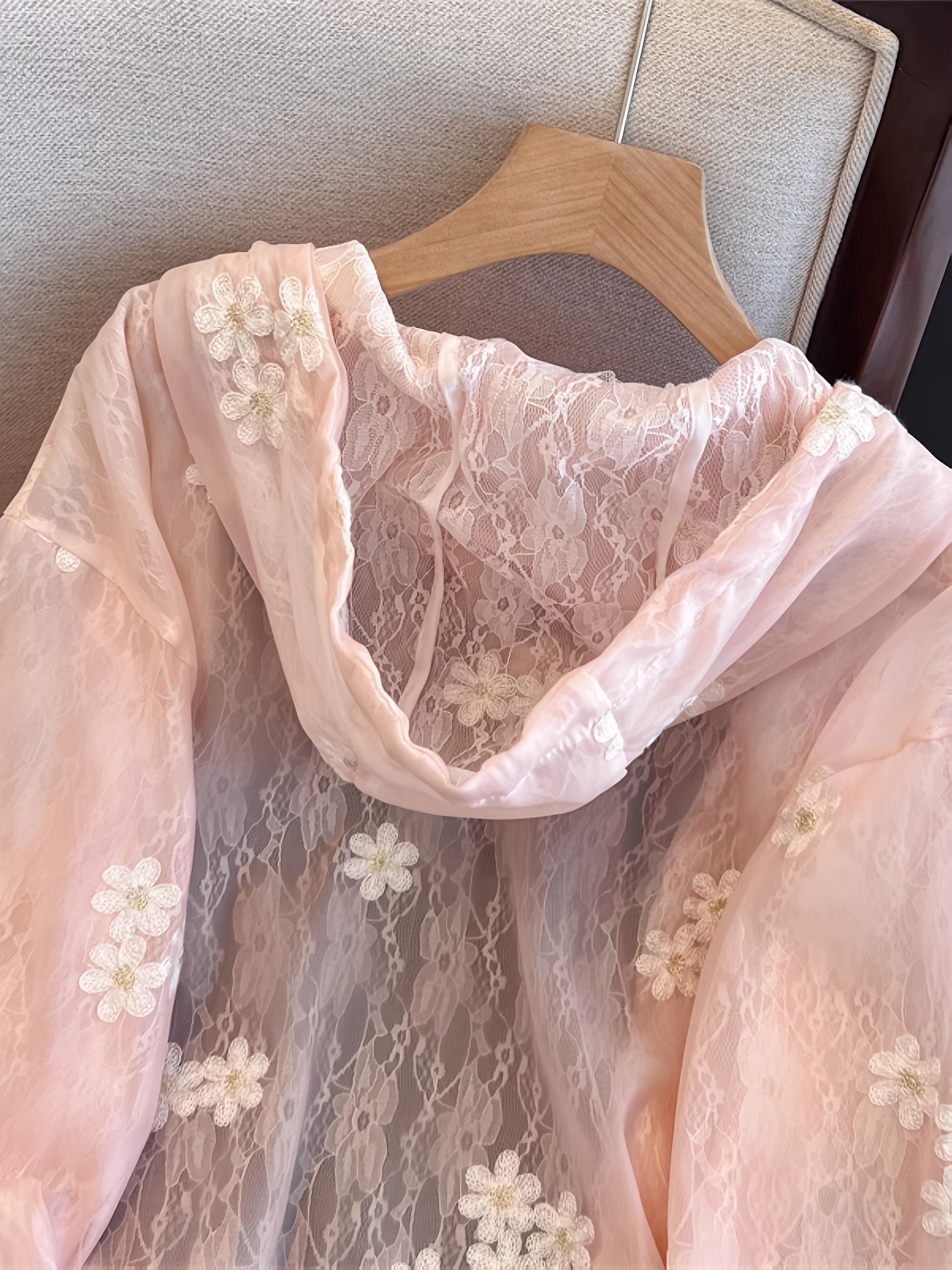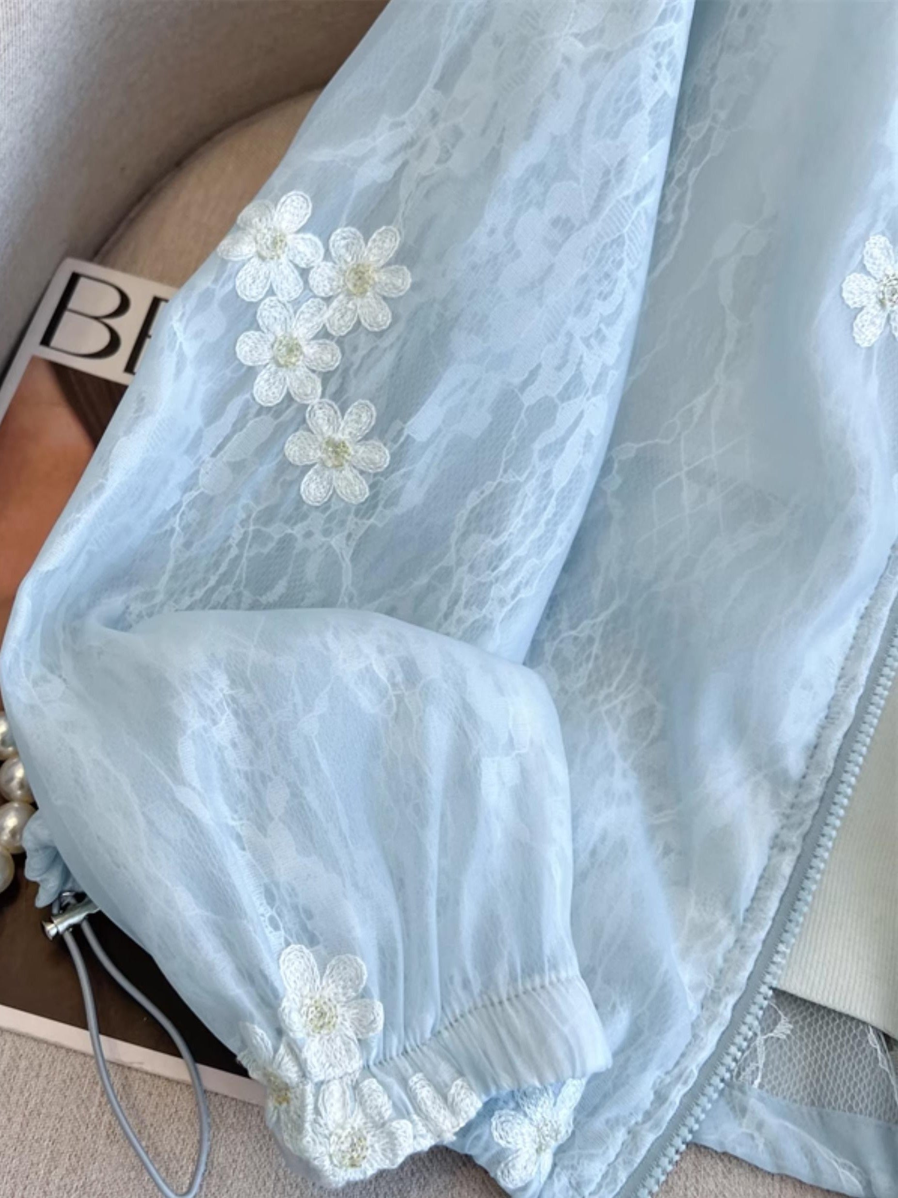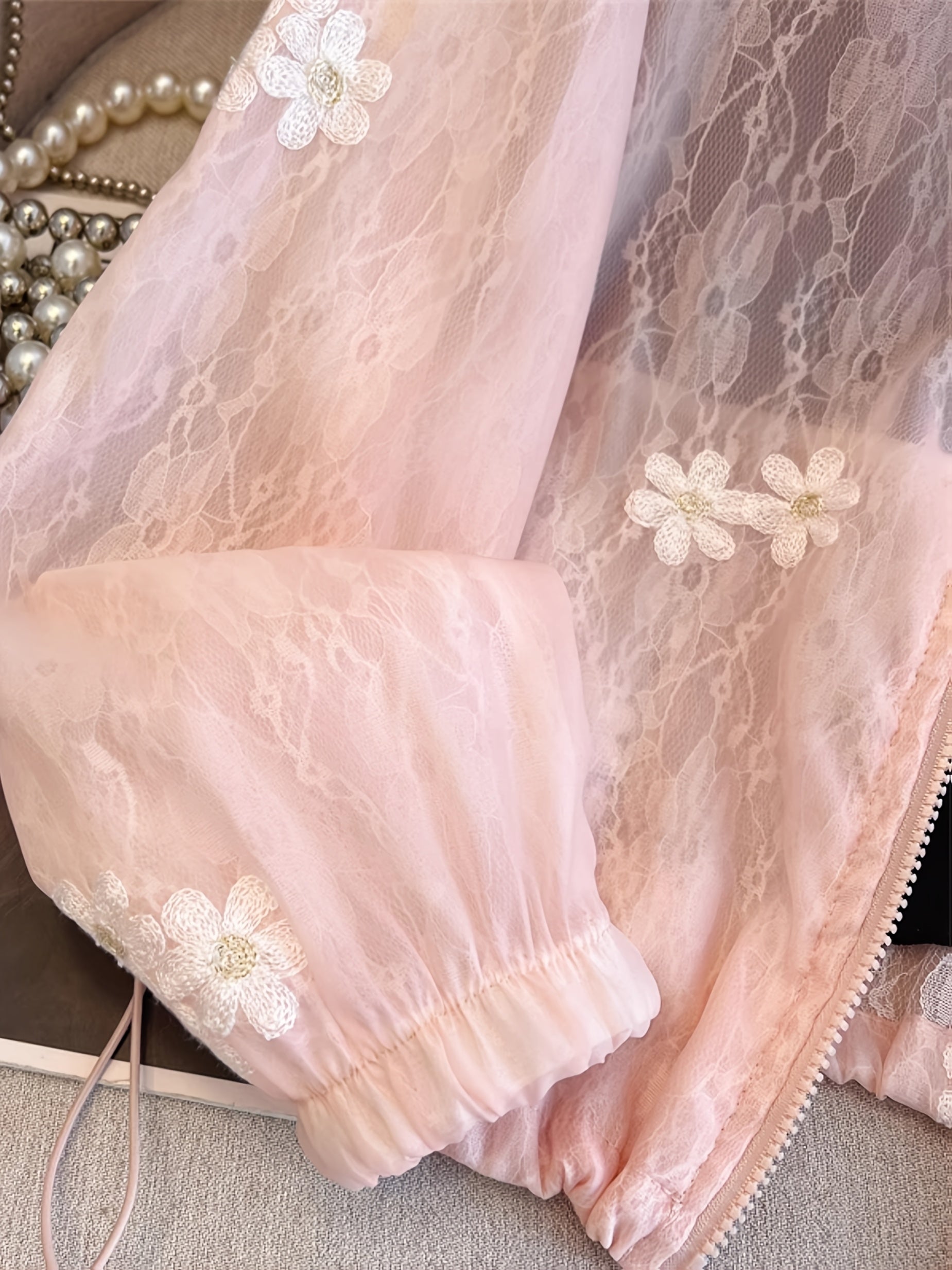 2025 Summer Women'S Lightweight Hooded Sun Jacket with Lace Trim, Semi-Breathable Long Sleeve Zip-Up Front Casual Outdoor Jacket + Top Two-Piece Set, Cute Women'S Style Soft Texture Fashion Design