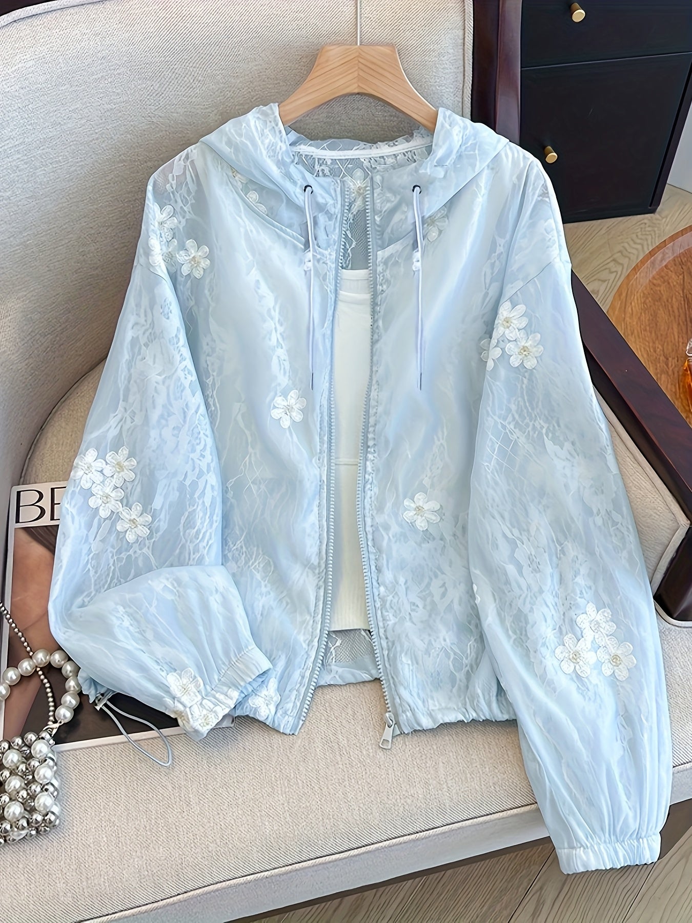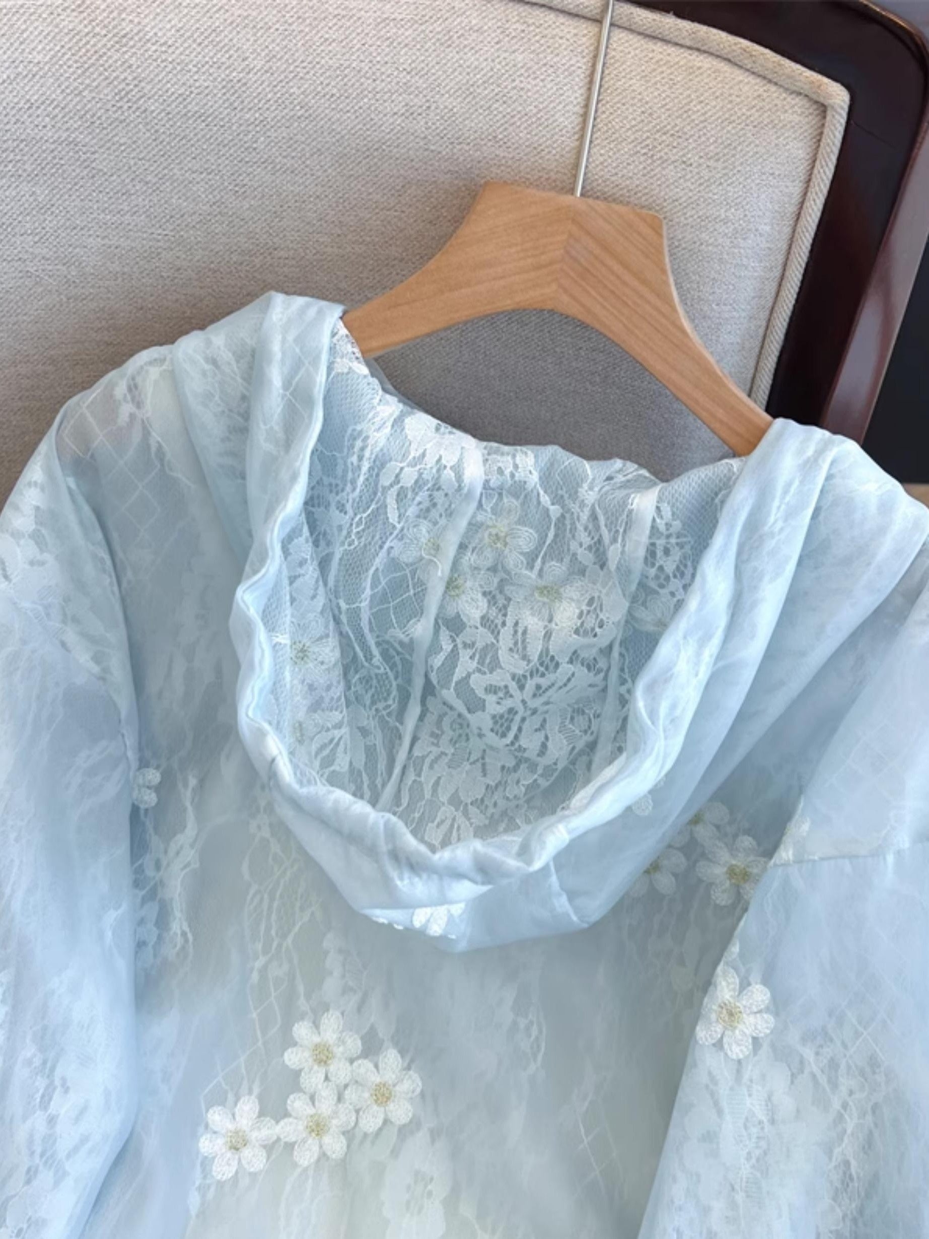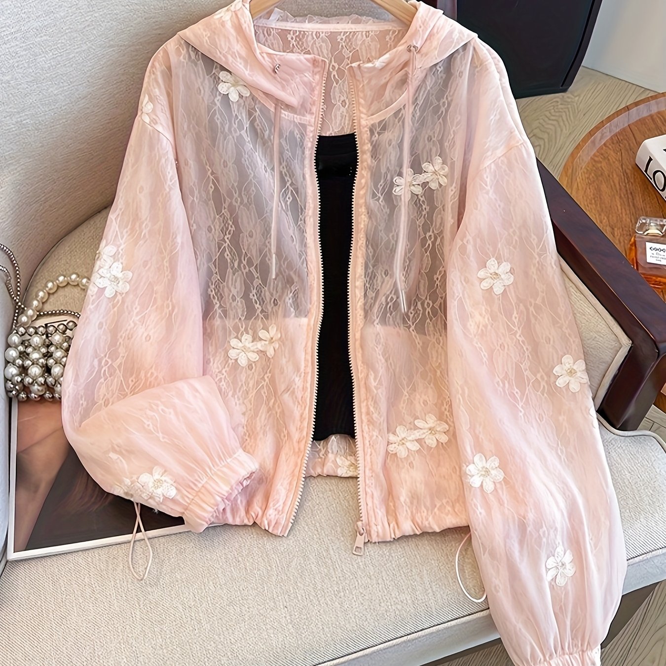 2025 Summer Women'S Lightweight Hooded Sun Jacket with Lace Trim, Semi-Breathable Long Sleeve Zip-Up Front Casual Outdoor Jacket + Top Two-Piece Set, Cute Women'S Style Soft Texture Fashion Design