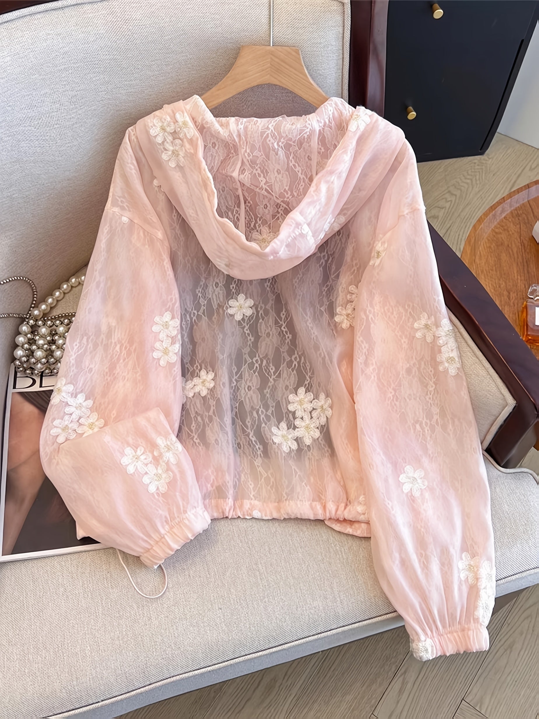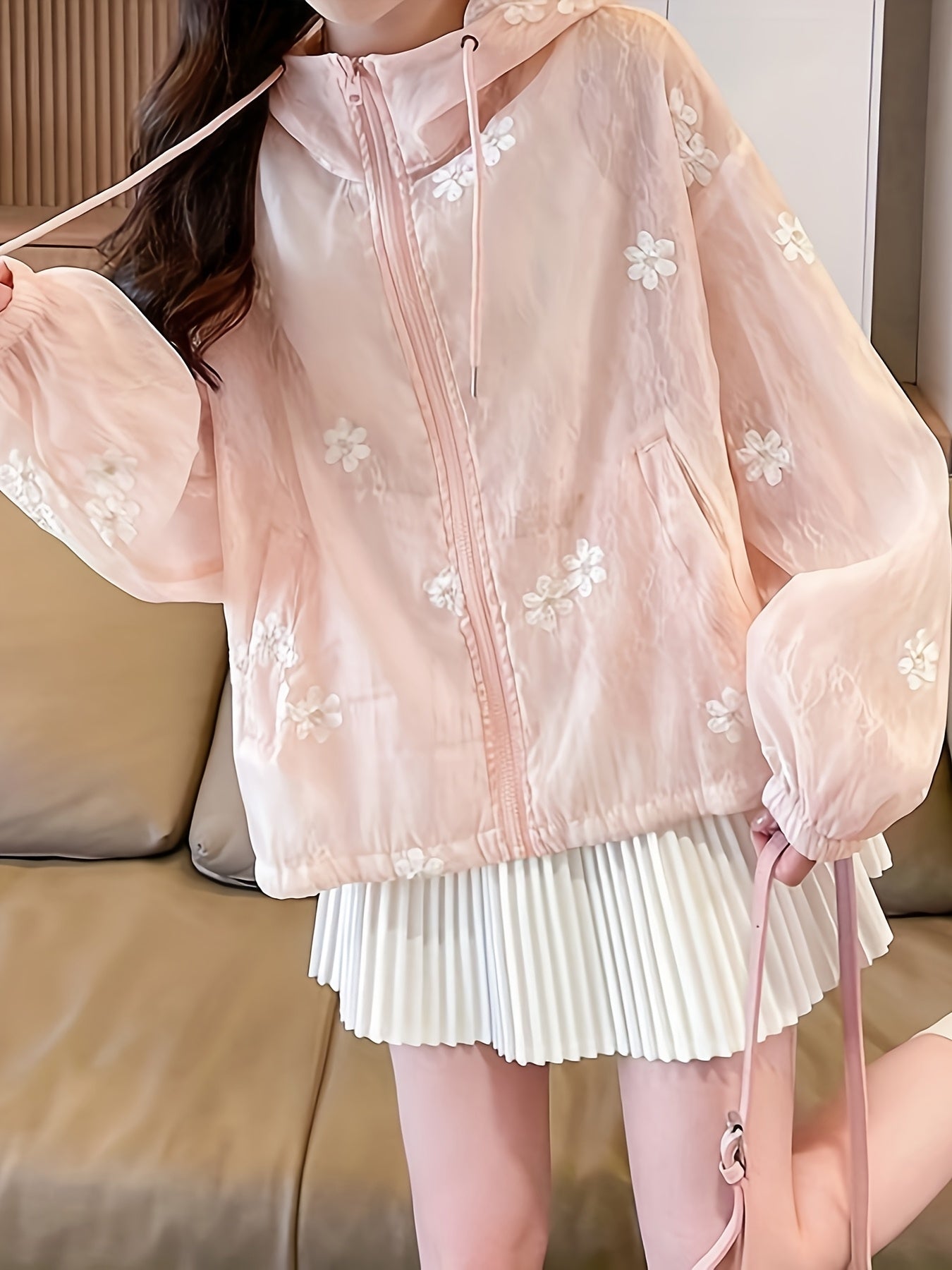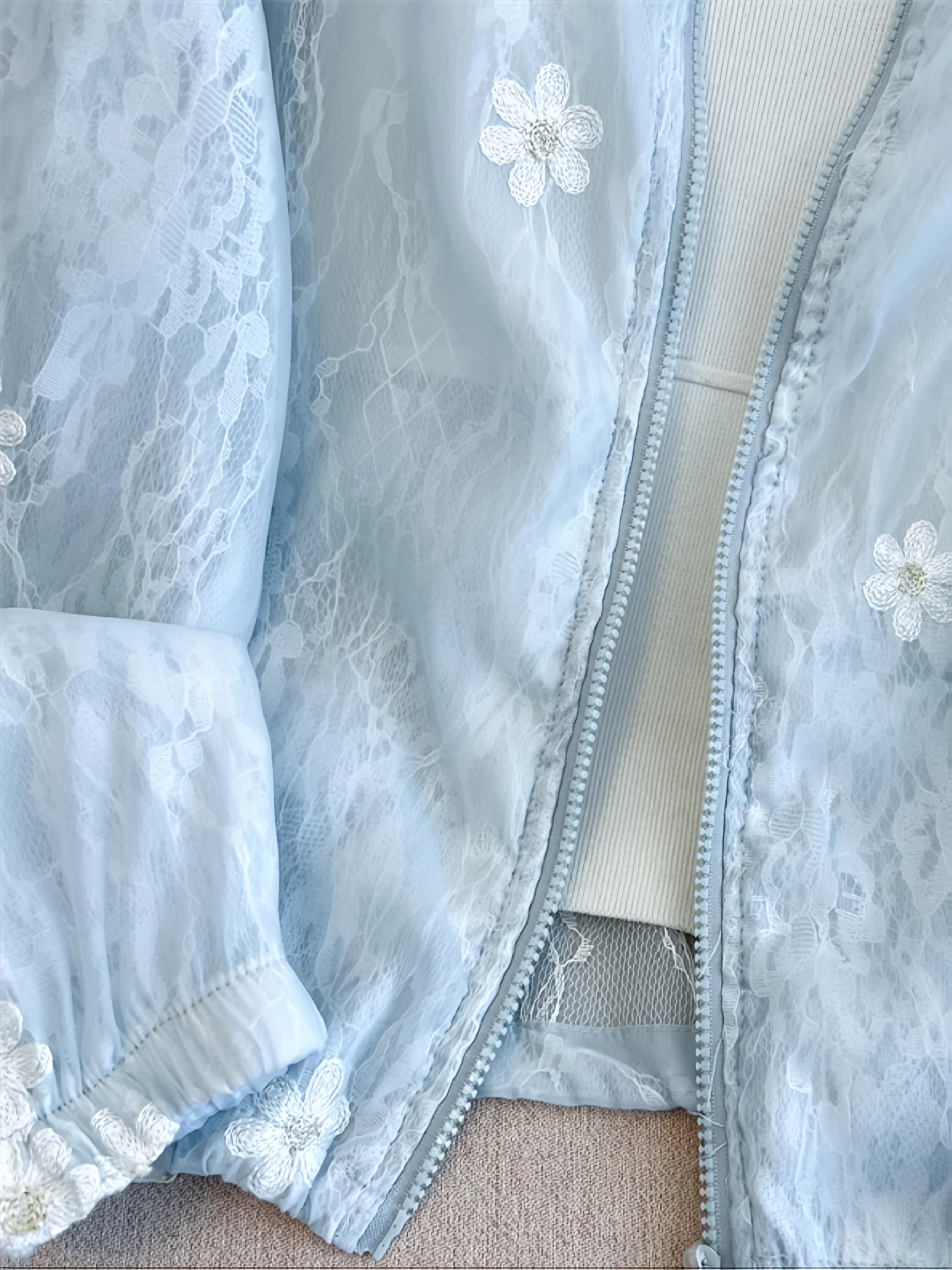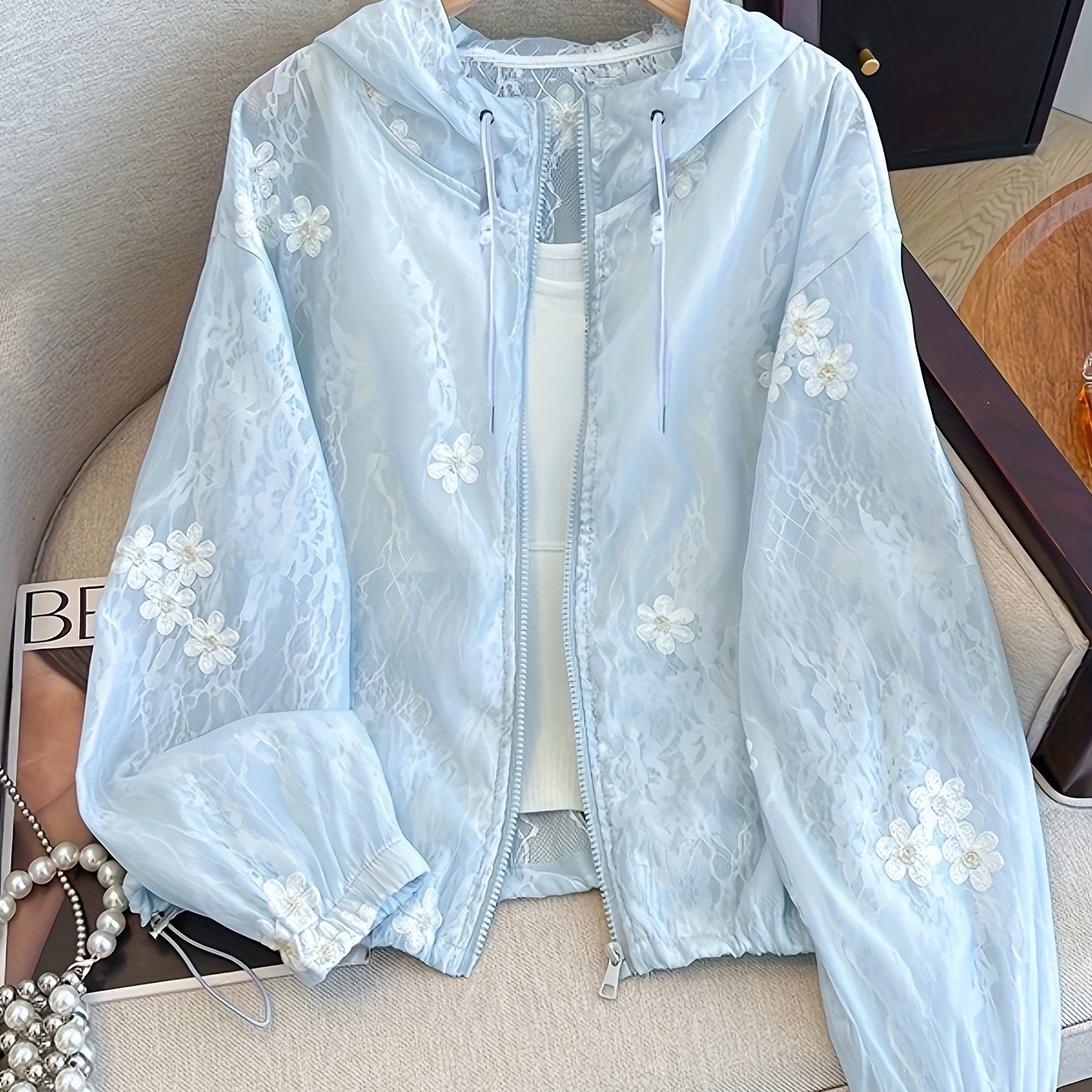 2025 Summer Women'S Lightweight Hooded Sun Jacket with Lace Trim, Semi-Breathable Long Sleeve Zip-Up Front Casual Outdoor Jacket + Top Two-Piece Set, Cute Women'S Style Soft Texture Fashion Design