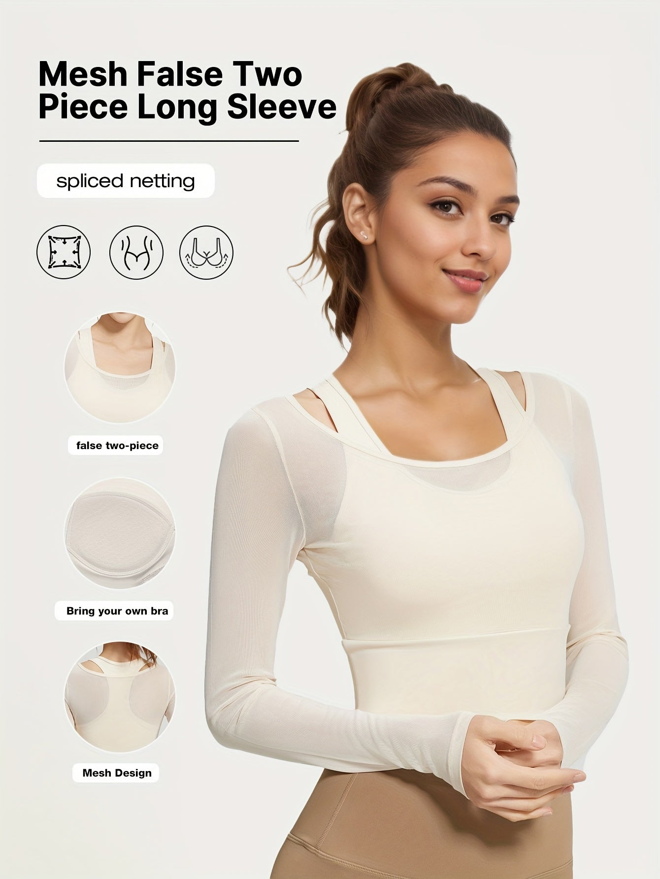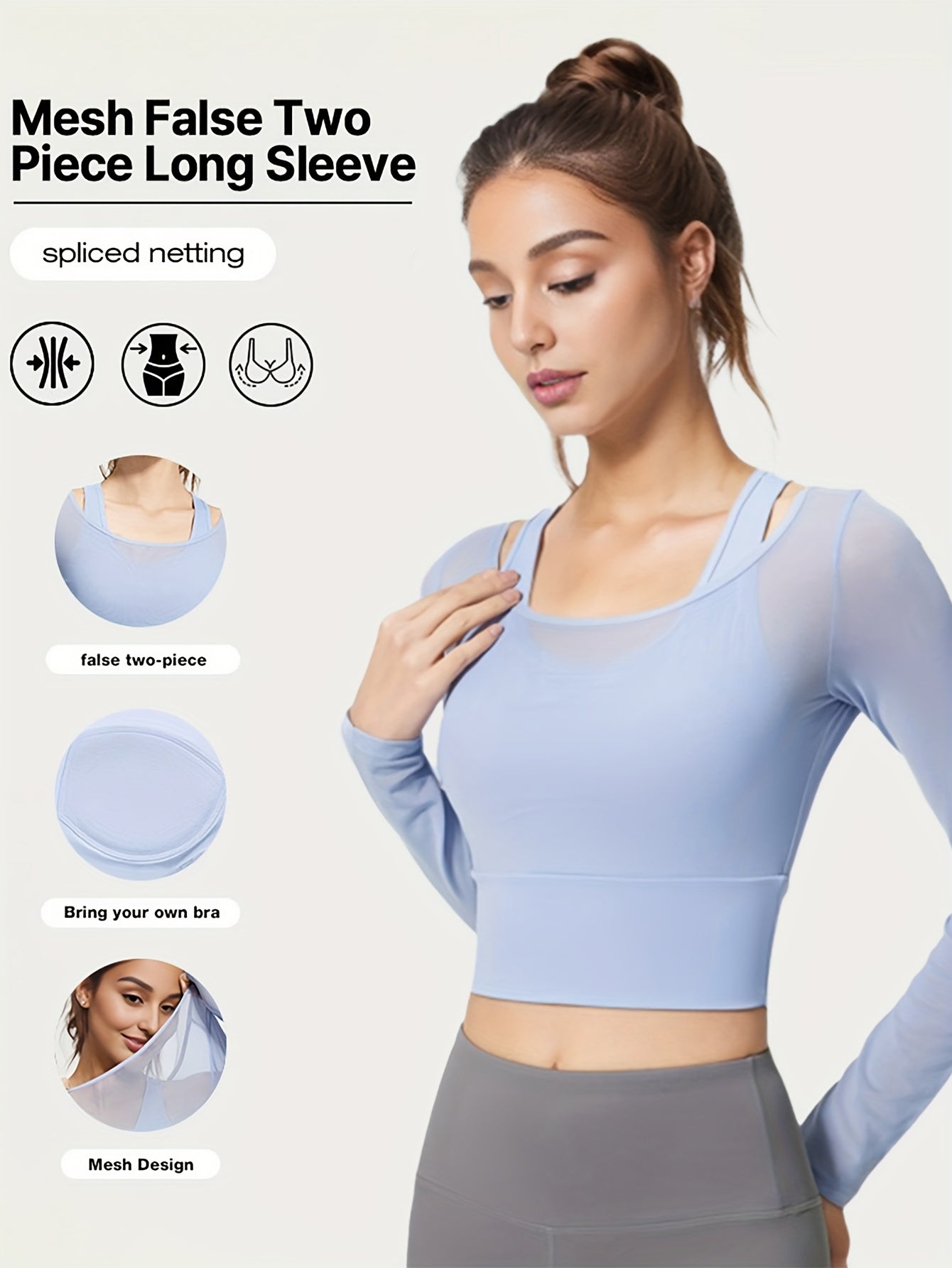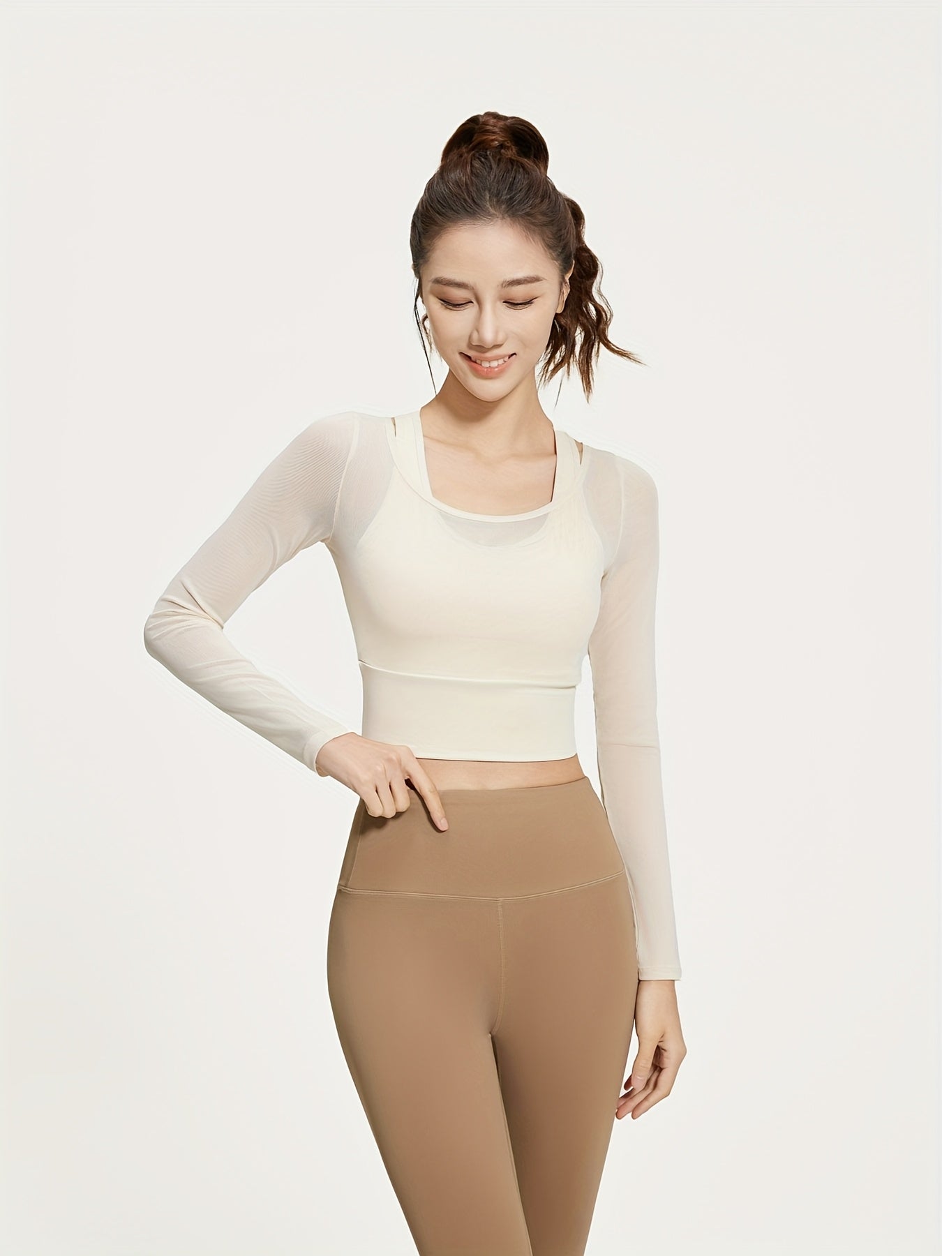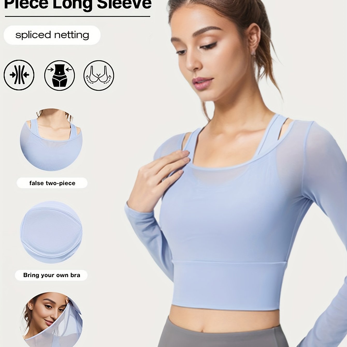 3 Colors New Spring\u002FSummer Mesh Two-Piece Yoga Set with Fixed Bra, Long Sleeve Women's Yoga Top, Slimming Elastic Waist Shaper, No-Bra Workout Fitness Shirt