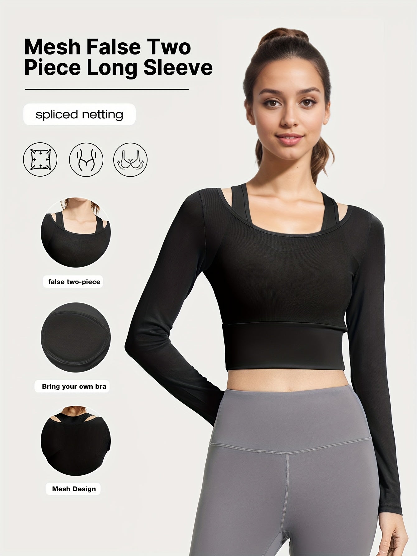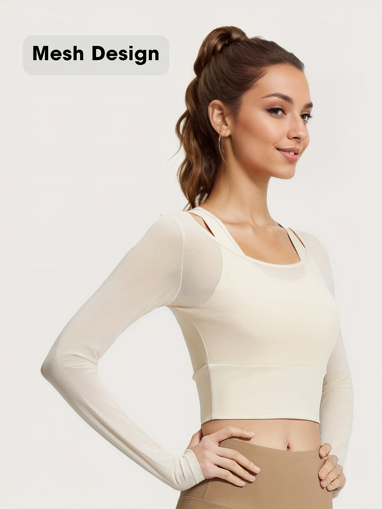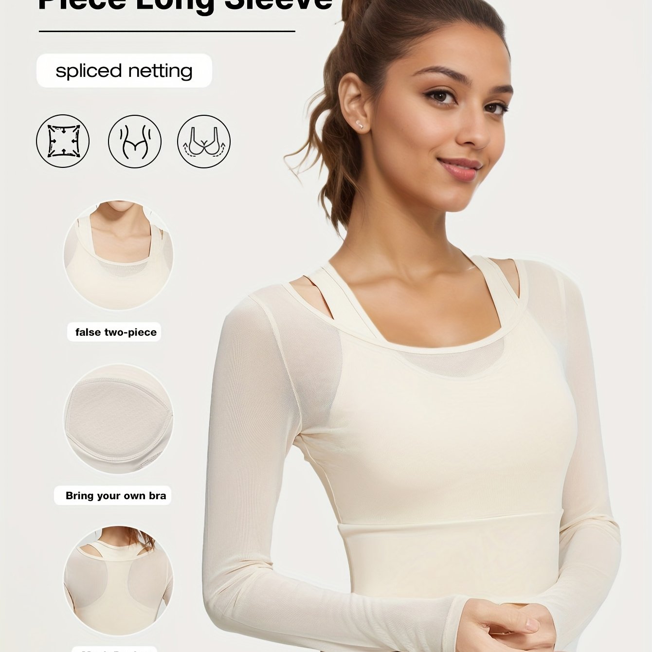 3 Colors New Spring\u002FSummer Mesh Two-Piece Yoga Set with Fixed Bra, Long Sleeve Women's Yoga Top, Slimming Elastic Waist Shaper, No-Bra Workout Fitness Shirt