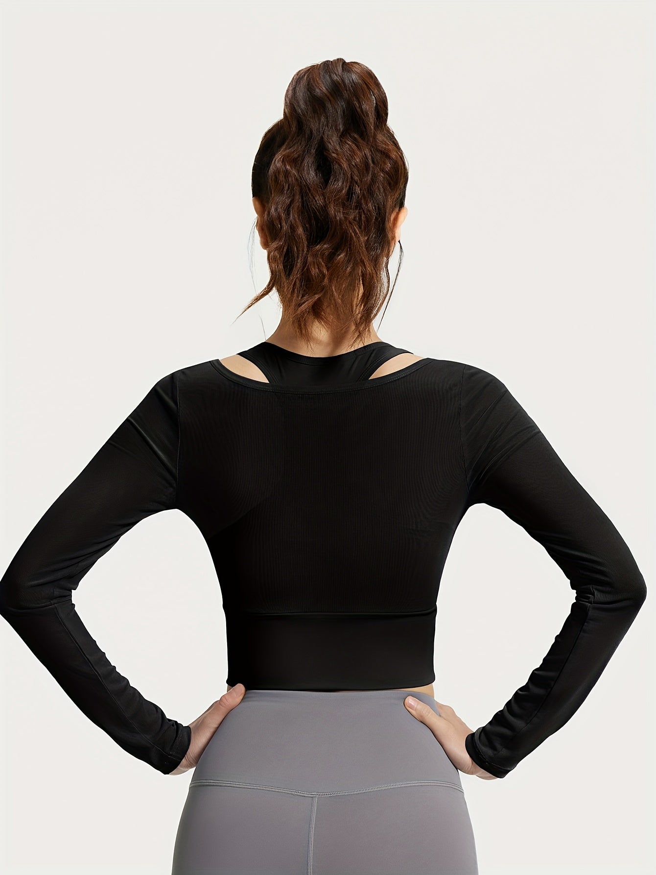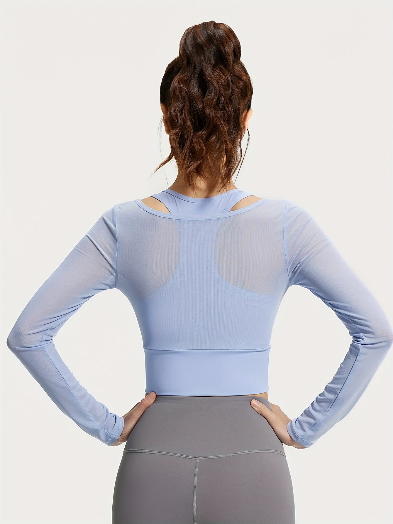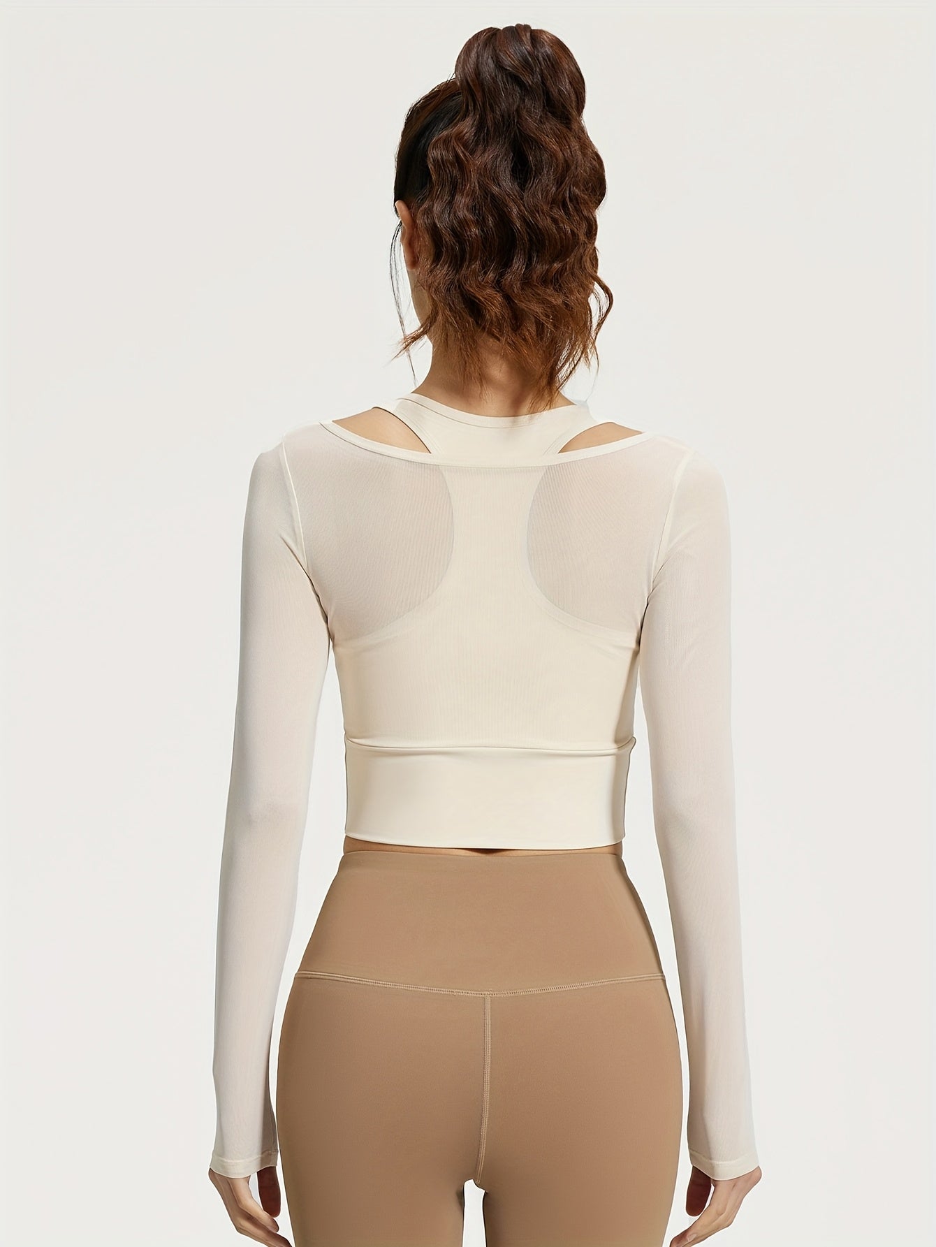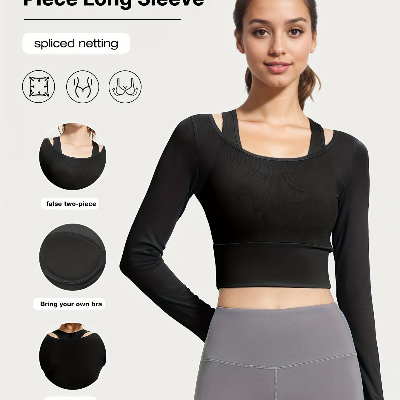 3 Colors New Spring\u002FSummer Mesh Two-Piece Yoga Set with Fixed Bra, Long Sleeve Women's Yoga Top, Slimming Elastic Waist Shaper, No-Bra Workout Fitness Shirt