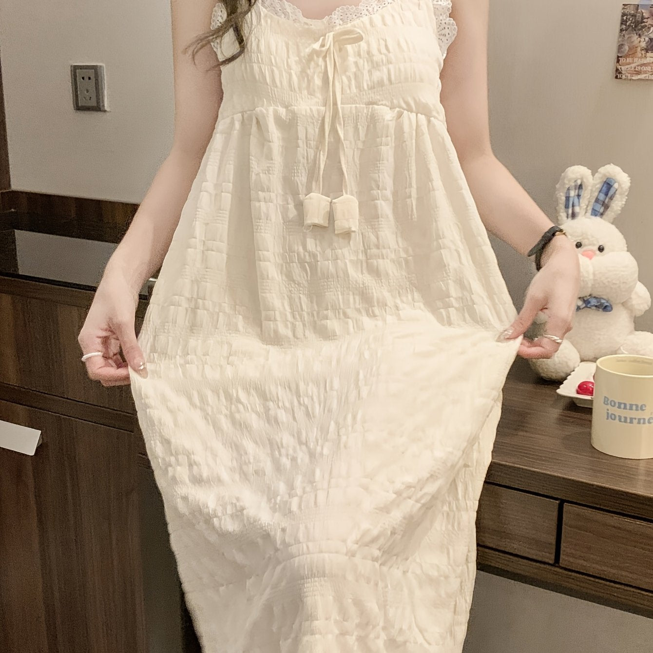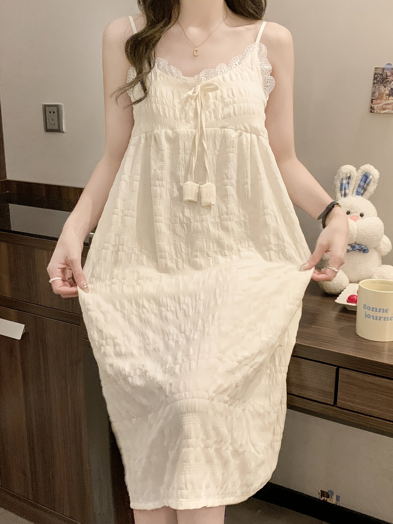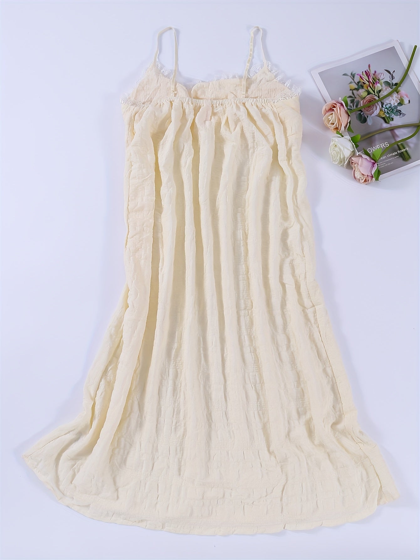 Elegant Off-Shoulder Mini Nightgown with Lace Trim - Sexy Solid Beige Cami Sleep Dress for Women, Soft Polyester Fabric, Summer Sleepwear and Loungewear, Casual Loungewear | Feminine Sleepwear | Polyester Nightgown