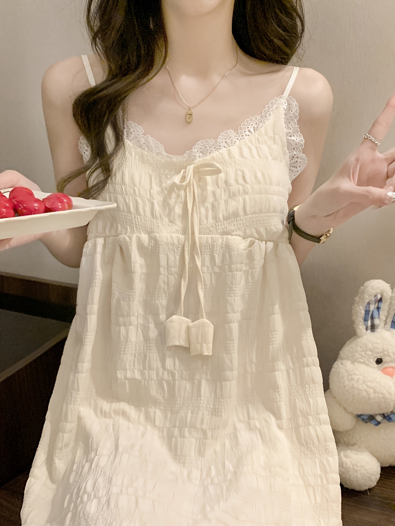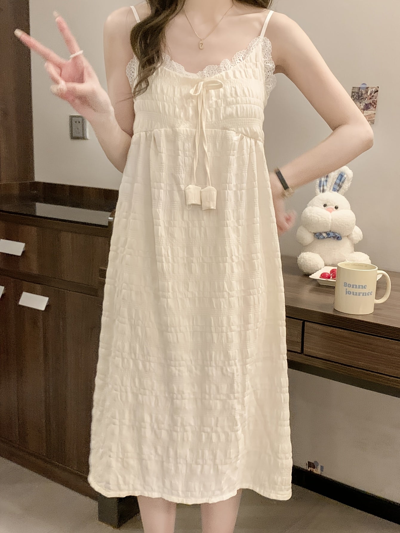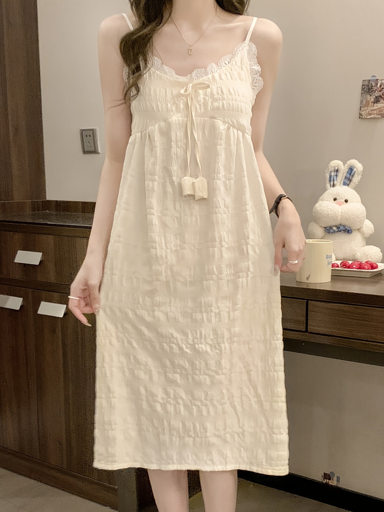 Elegant Off-Shoulder Mini Nightgown with Lace Trim - Sexy Solid Beige Cami Sleep Dress for Women, Soft Polyester Fabric, Summer Sleepwear and Loungewear, Casual Loungewear | Feminine Sleepwear | Polyester Nightgown