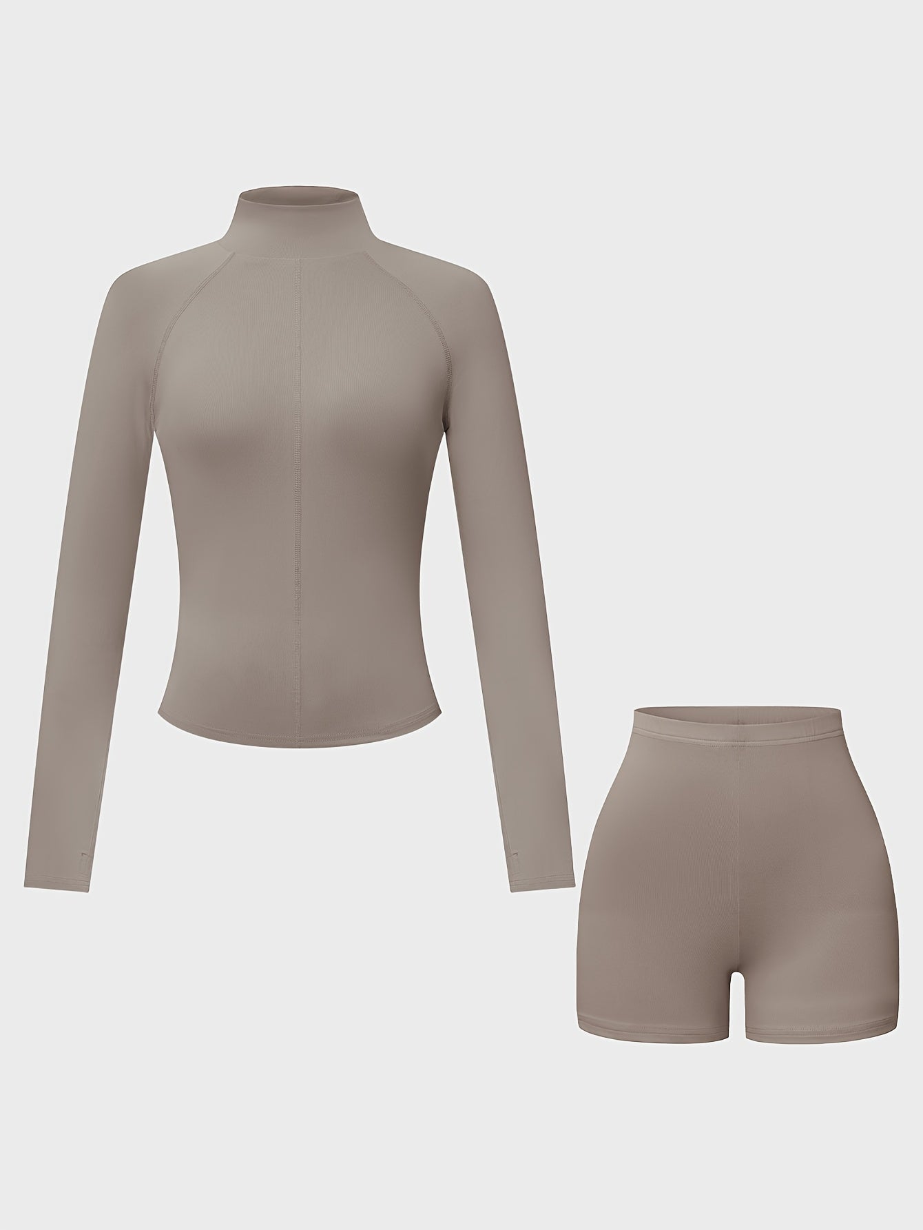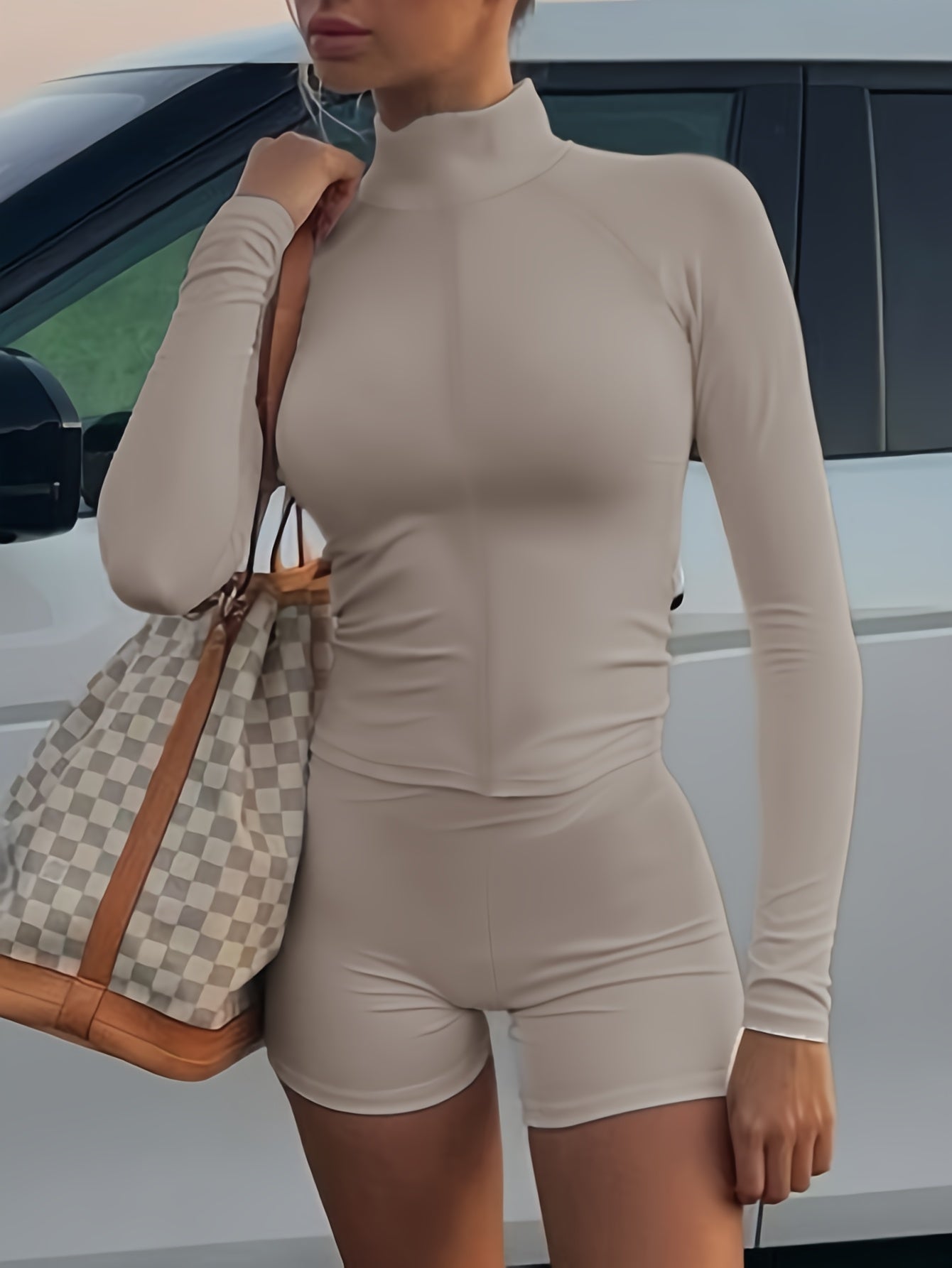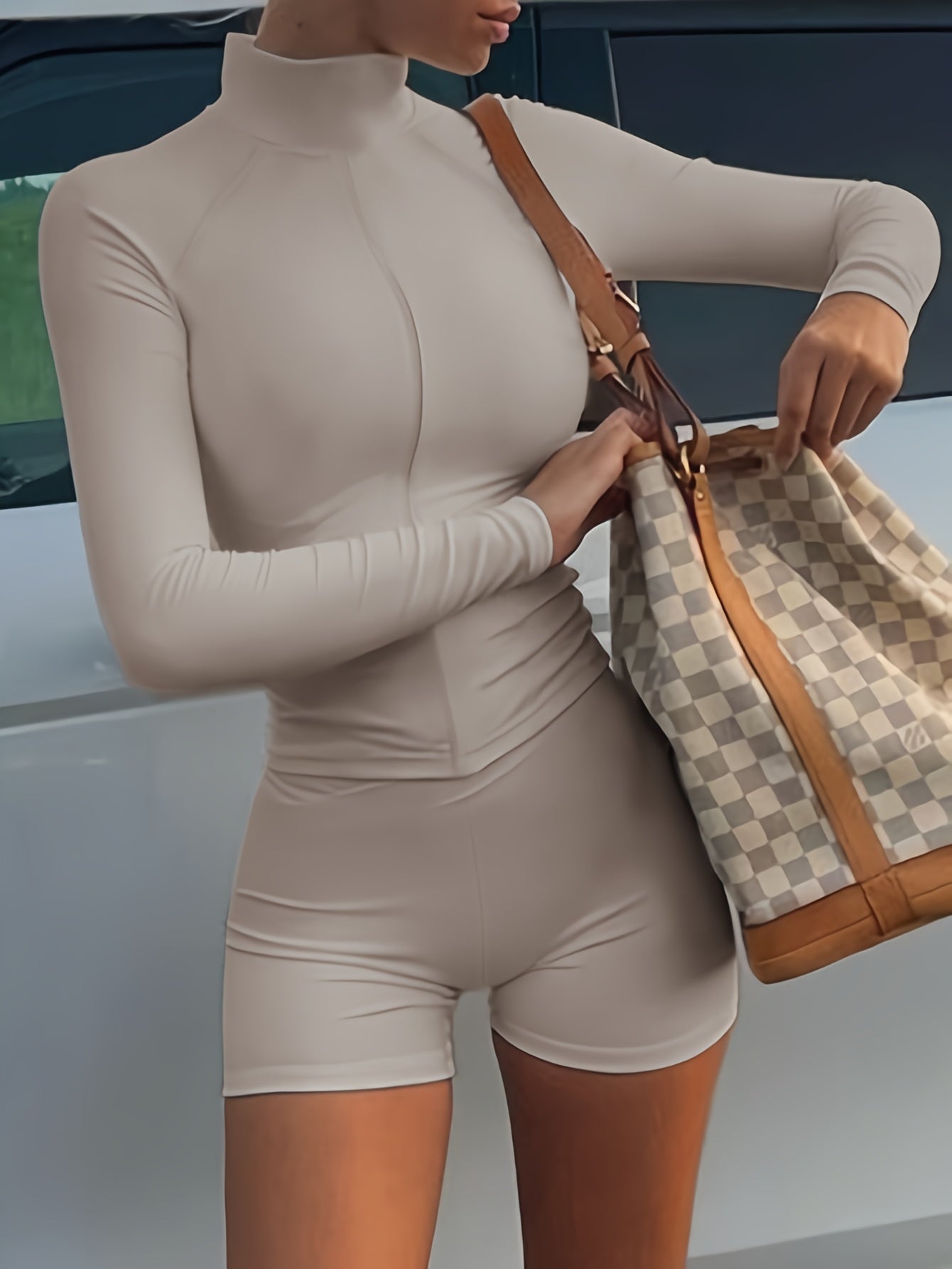 Fashionable Women's 2pcs Yoga Sports Suit, Elegant Small Turtleneck, High Waist Sports Shorts, High Elasticity, Suitable for Running, Yoga, Cycling, Fitness, Studio, Casual Outing, Evening Date, Daily Wear