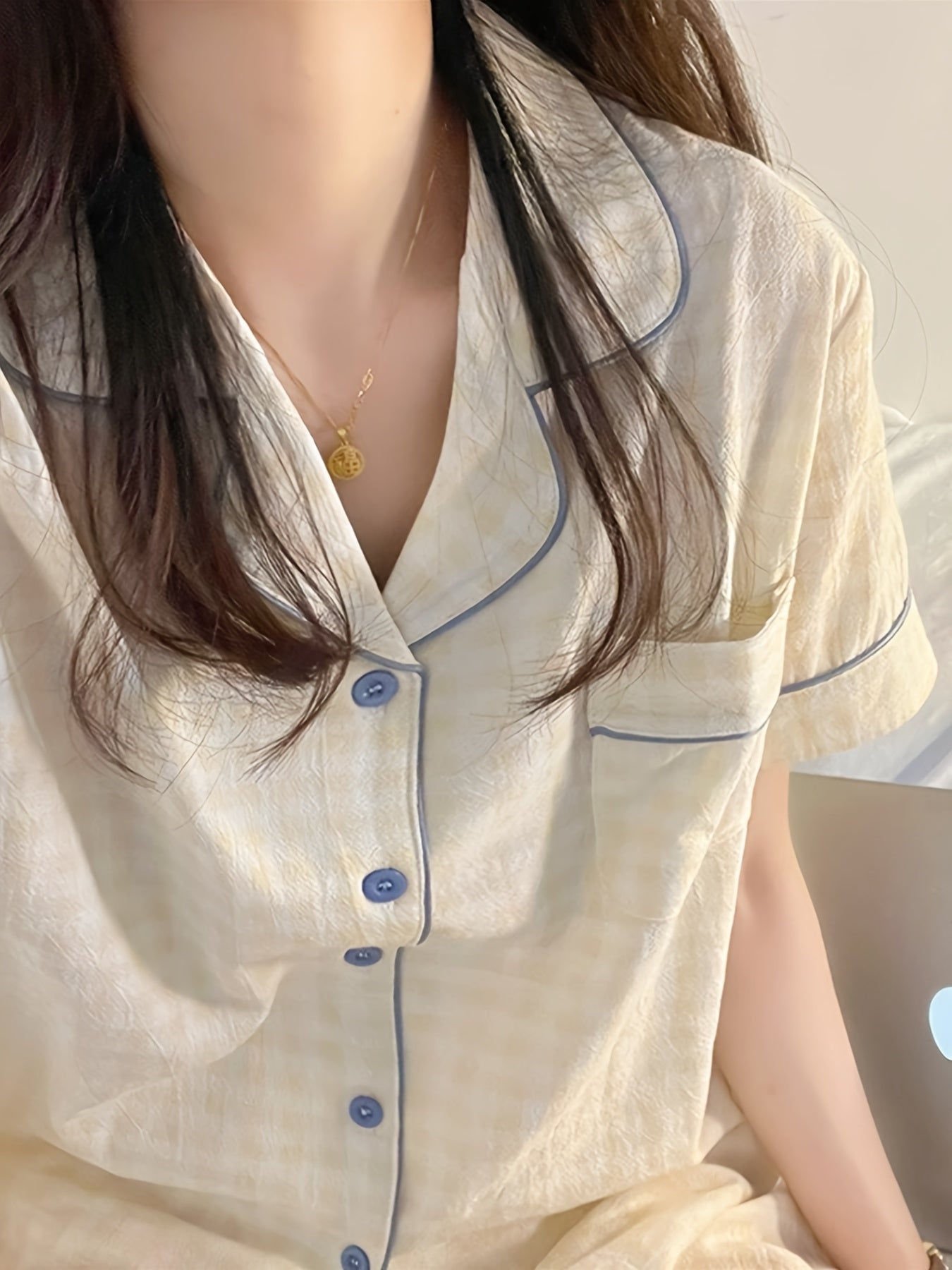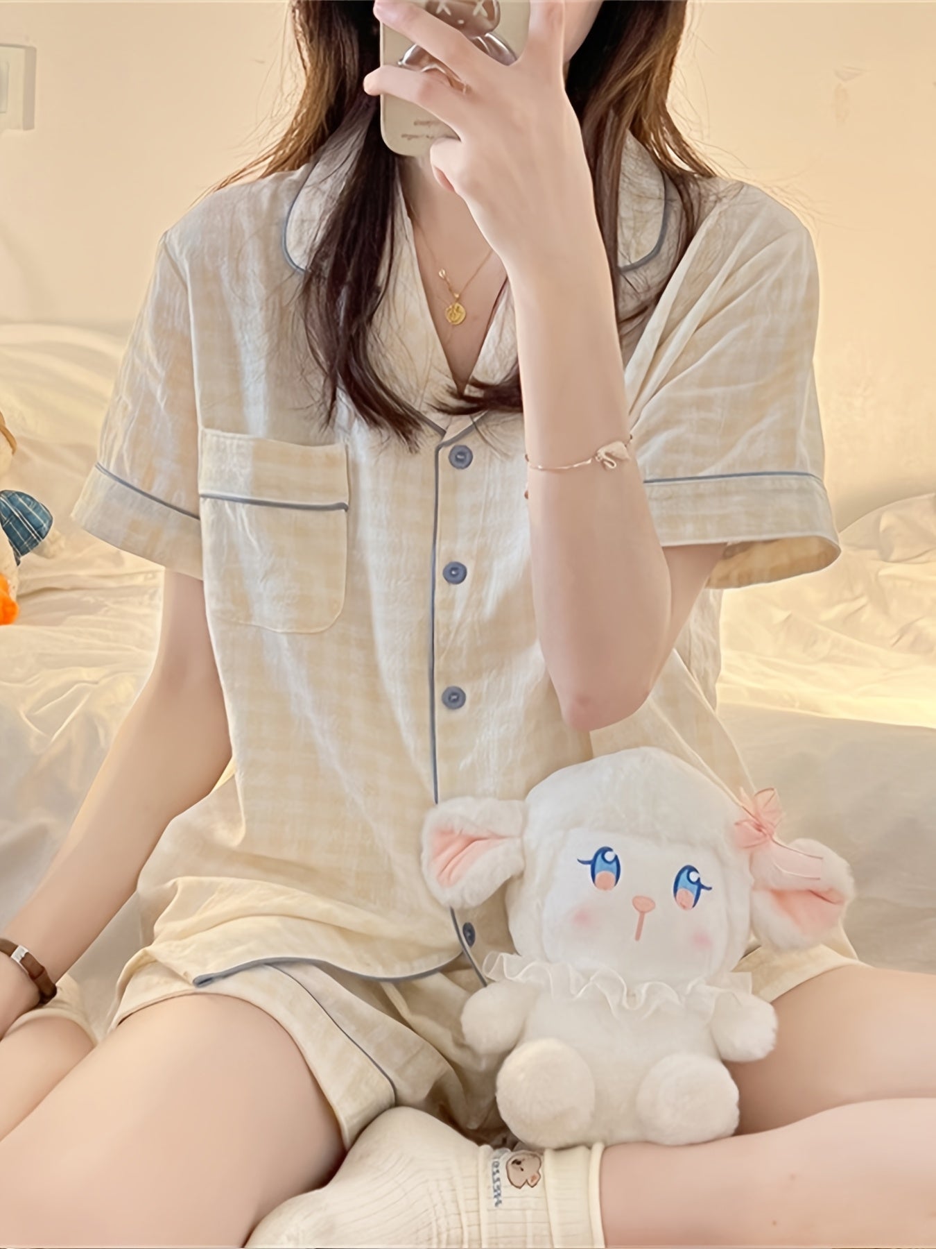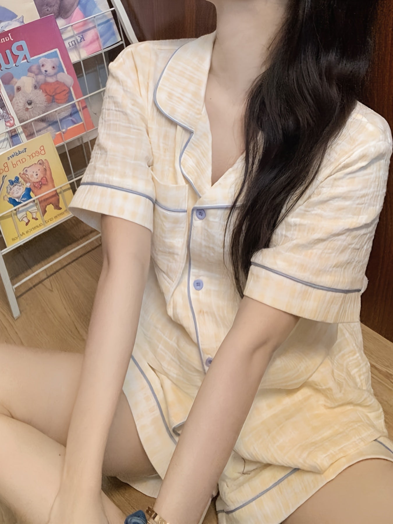 ins Sweet Style Yellow Plaid Short Sleeve 2pcs Set 2025 New Home Clothes Comfortable and Wearable