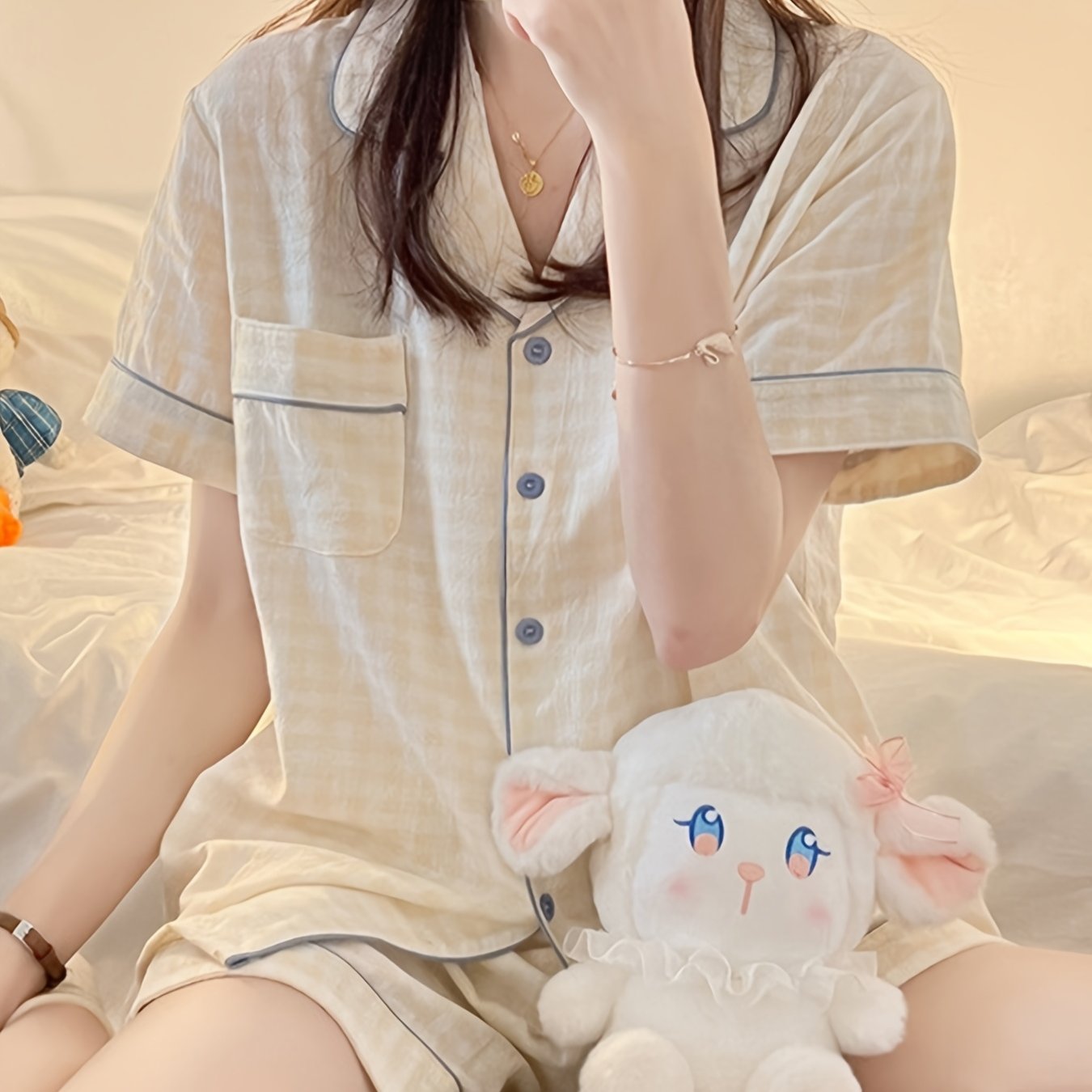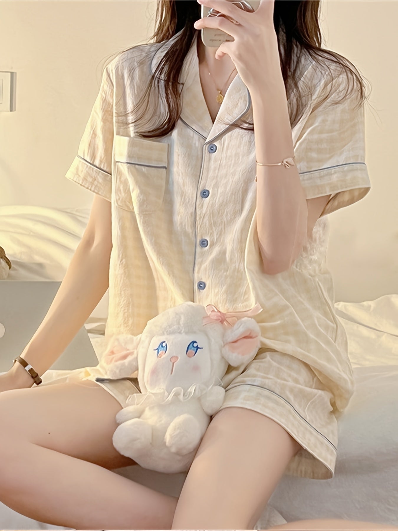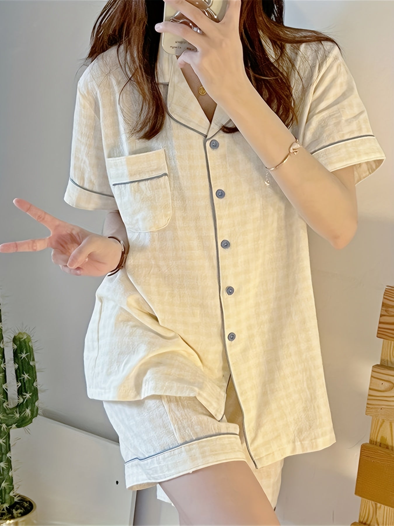 ins Sweet Style Yellow Plaid Short Sleeve 2pcs Set 2025 New Home Clothes Comfortable and Wearable