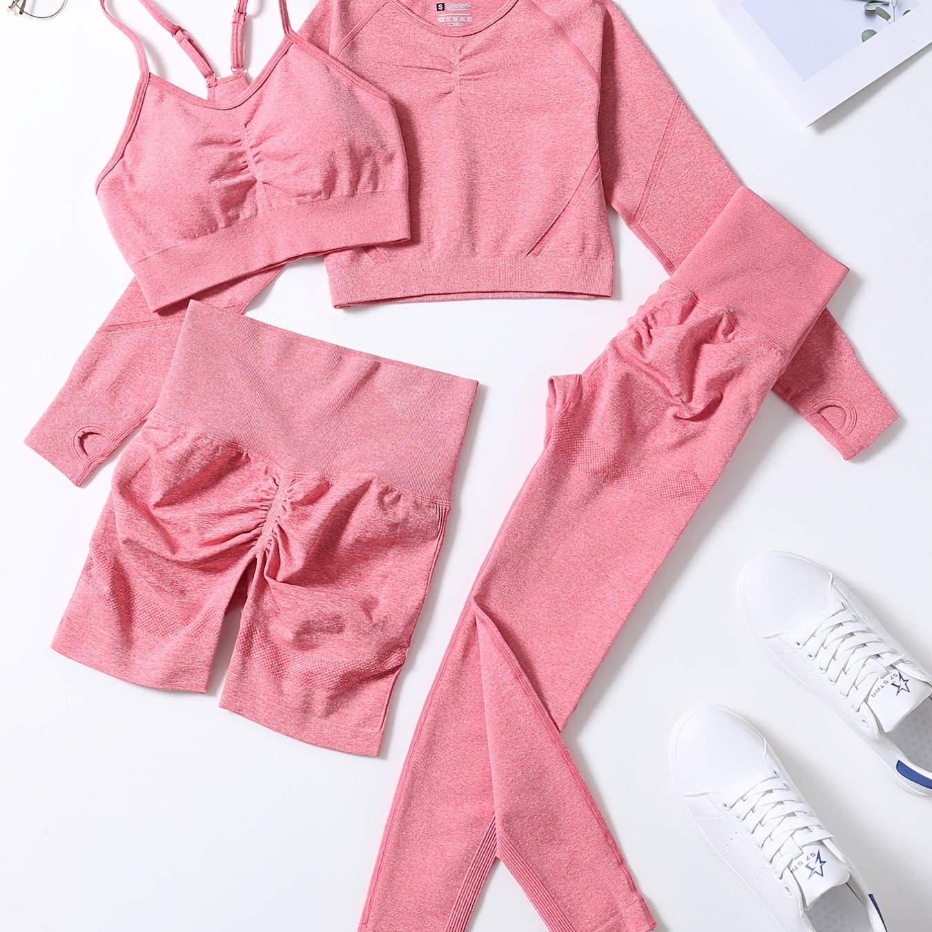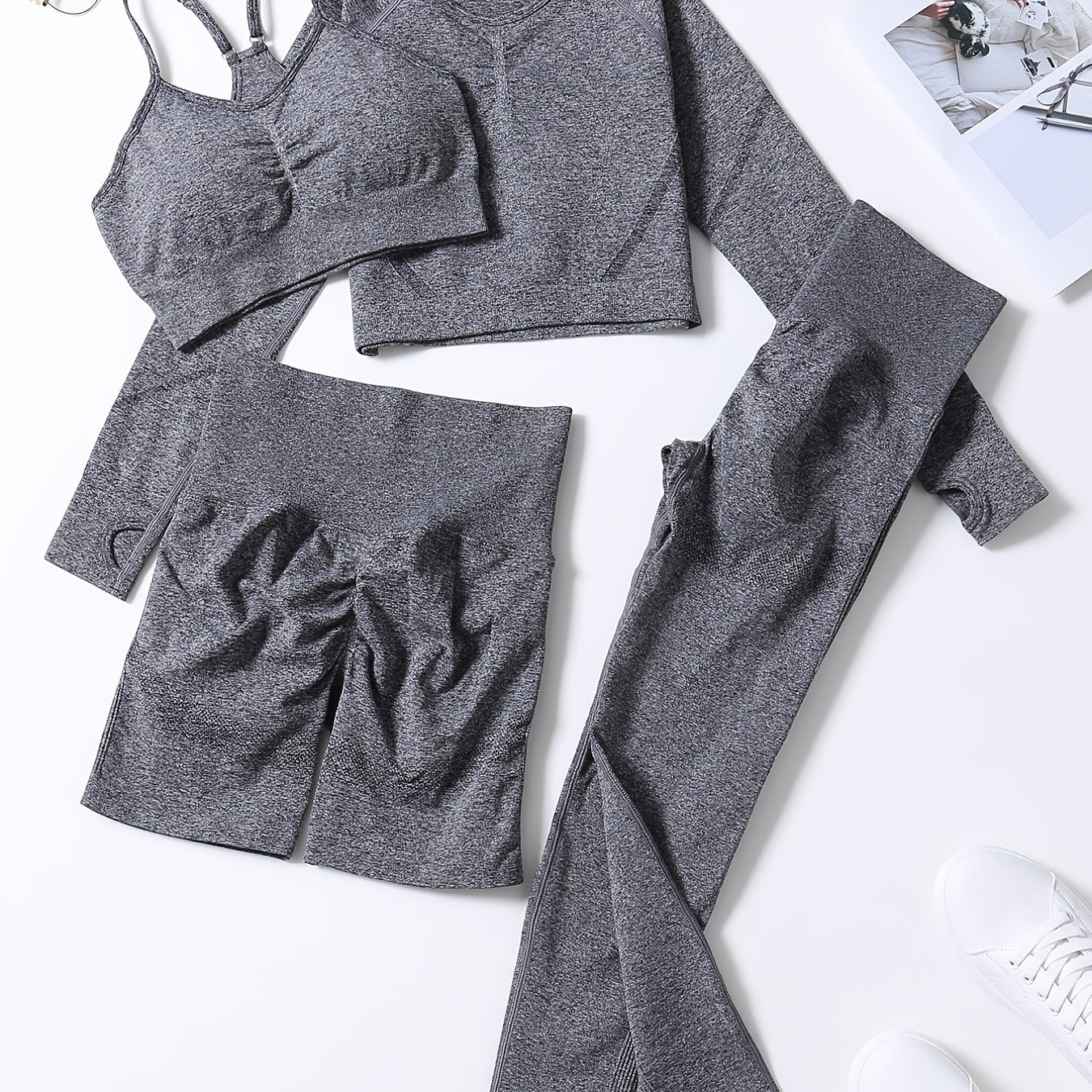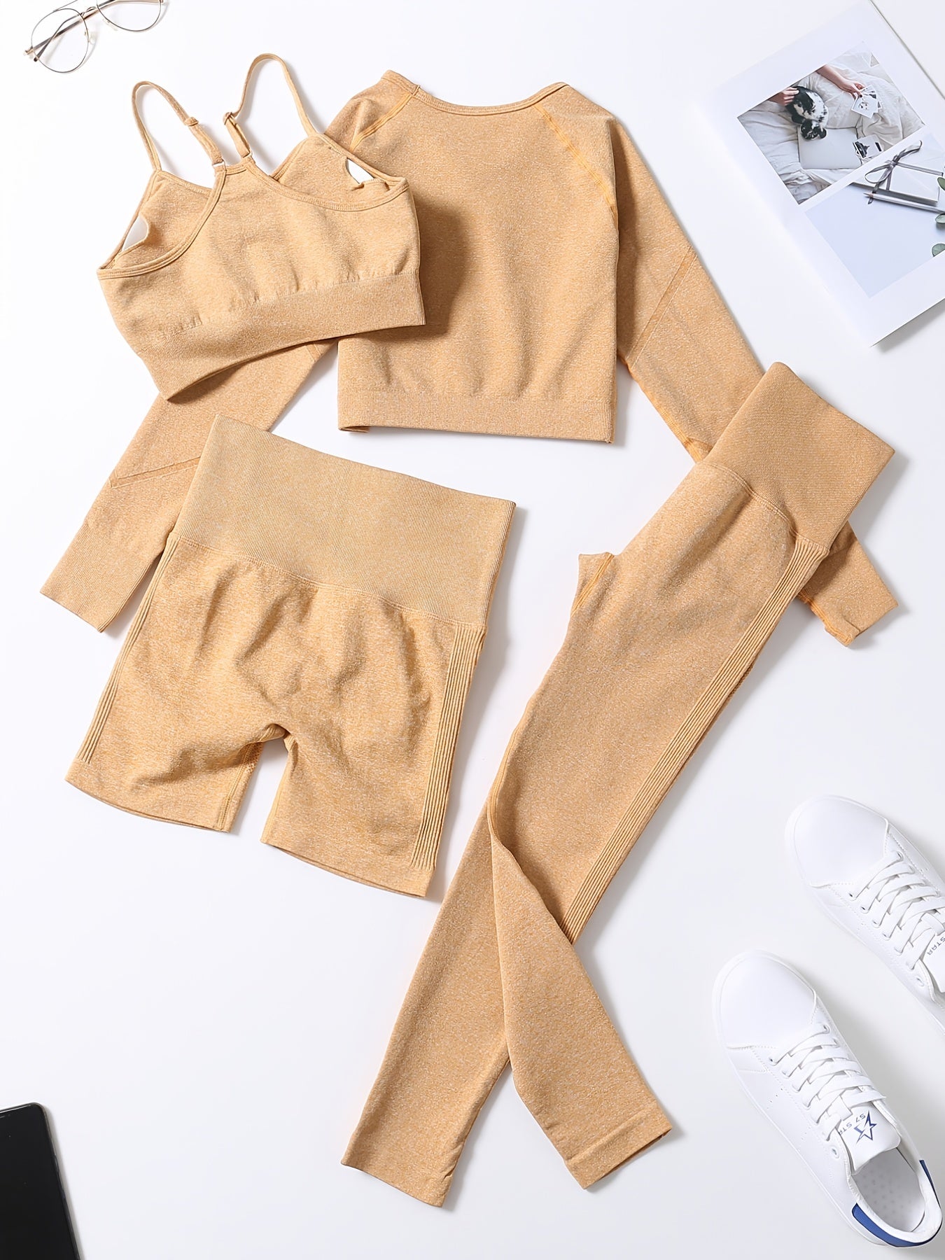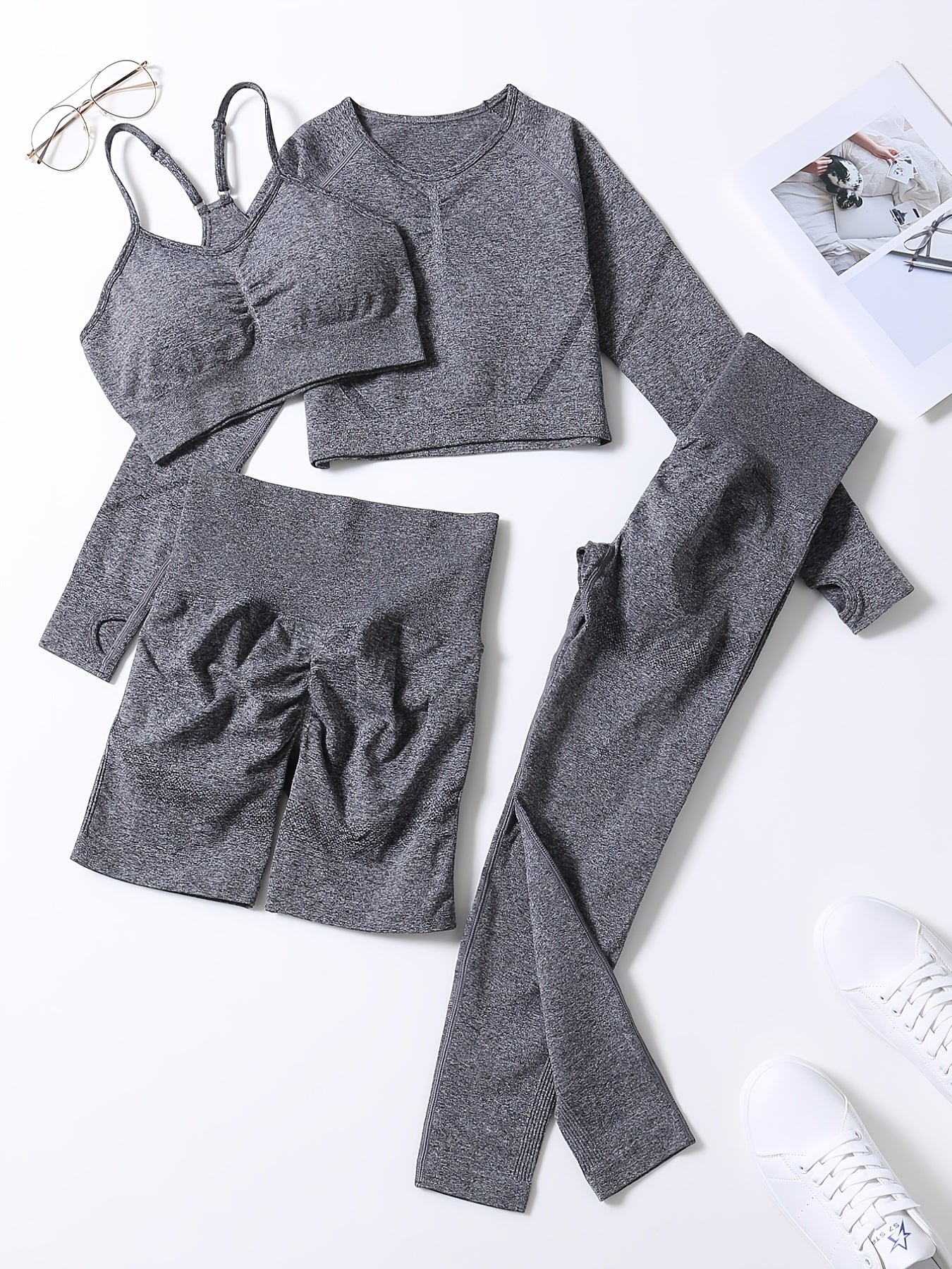Smiling Face Style Workout Outfits for Women 4pcs Ribbed Seamless Crop Tank High Waist Yoga Leggings Sets
