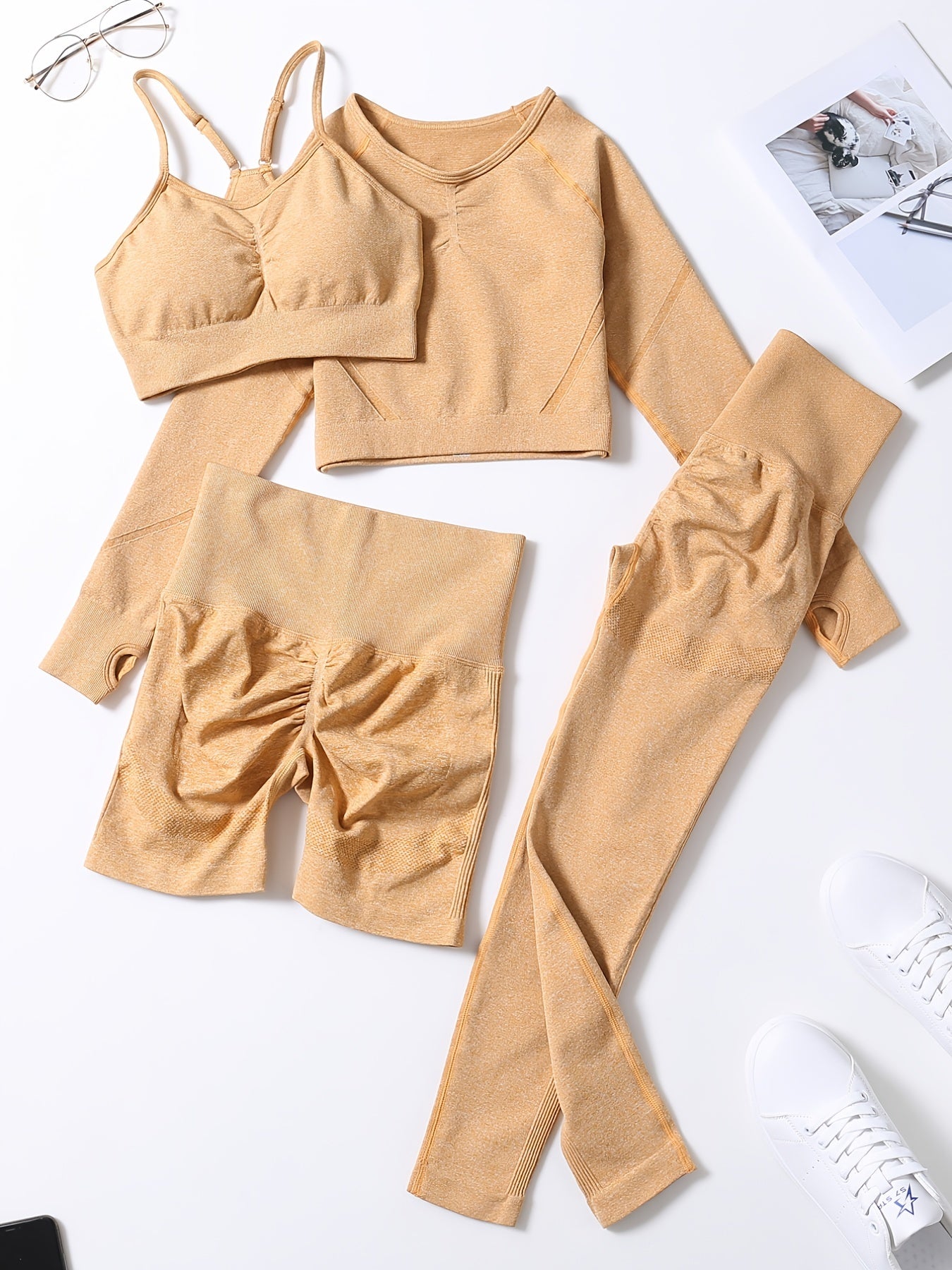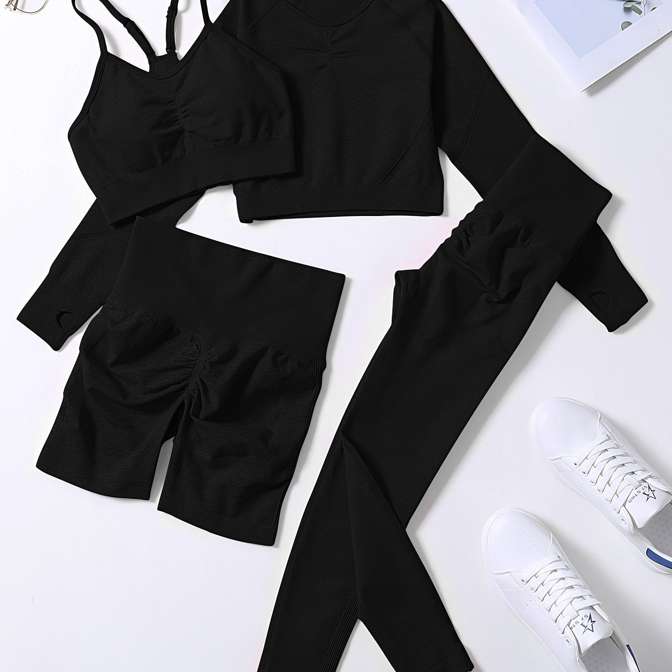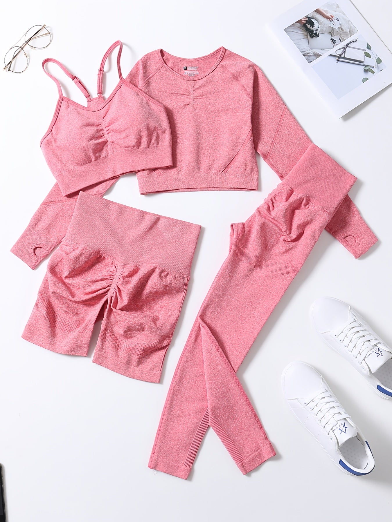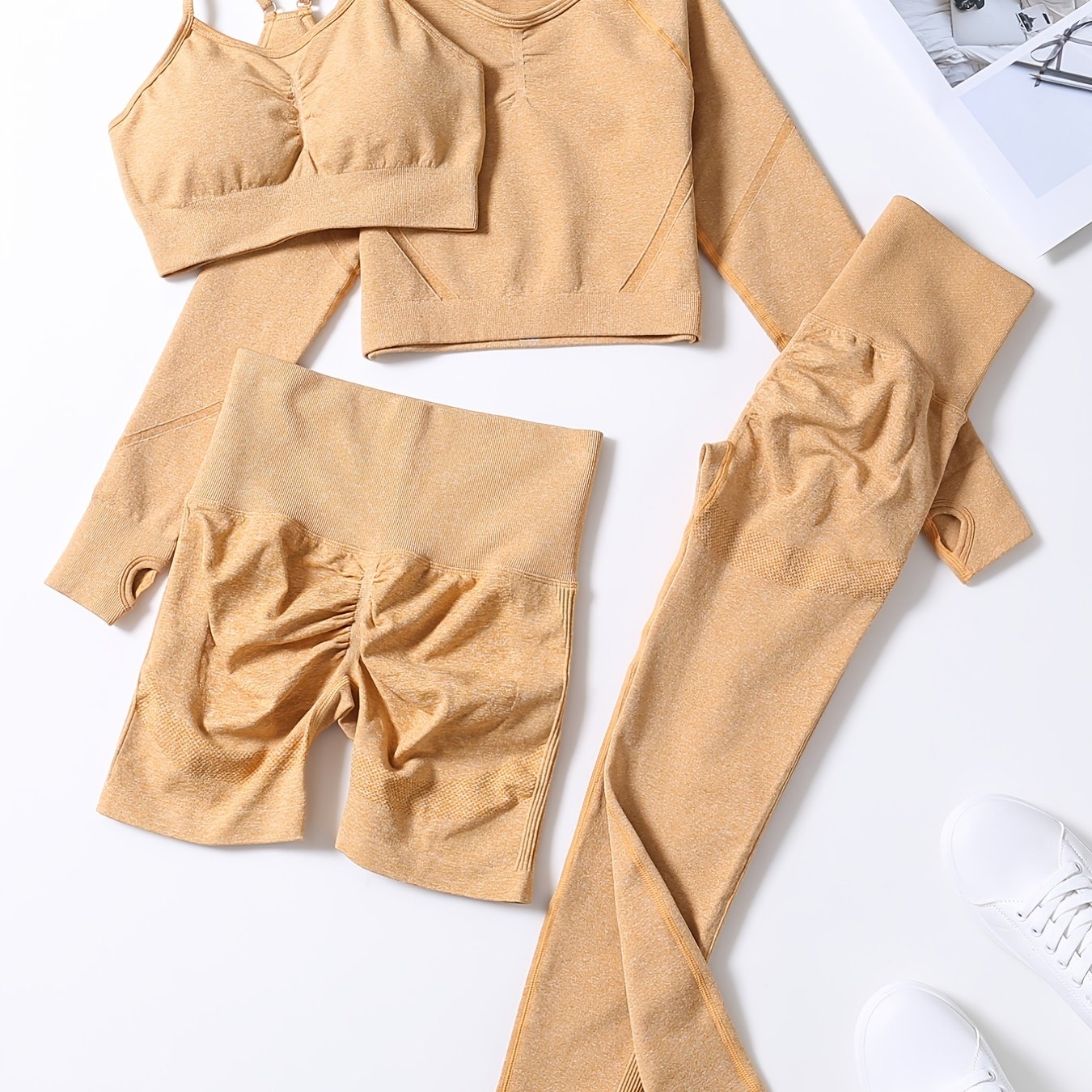 Smiling Face Style Workout Outfits for Women 4pcs Ribbed Seamless Crop Tank High Waist Yoga Leggings Sets