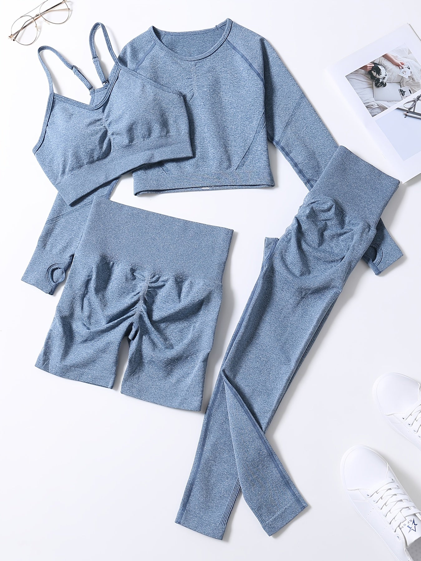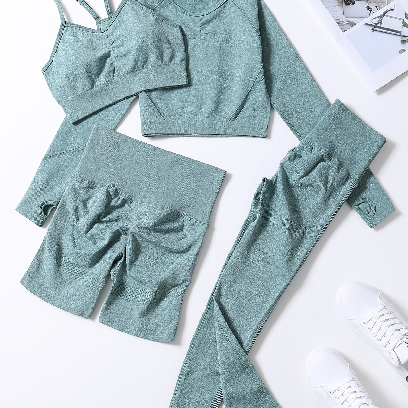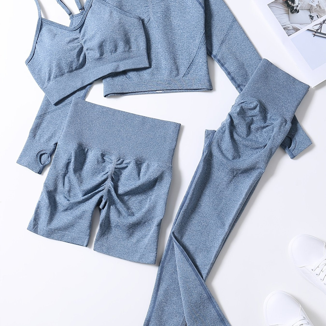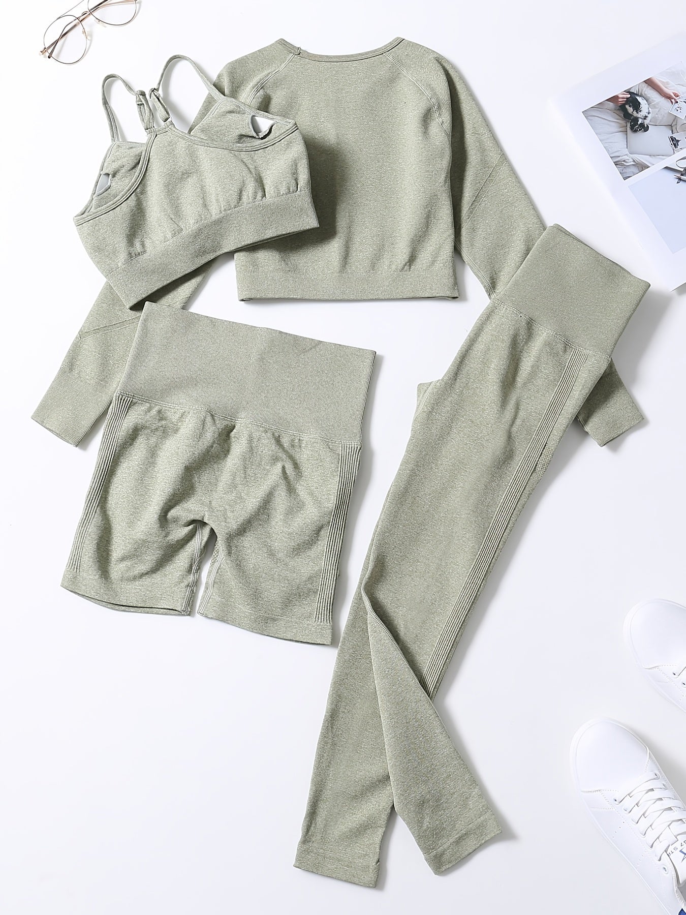 Smiling Face Style Workout Outfits for Women 4pcs Ribbed Seamless Crop Tank High Waist Yoga Leggings Sets