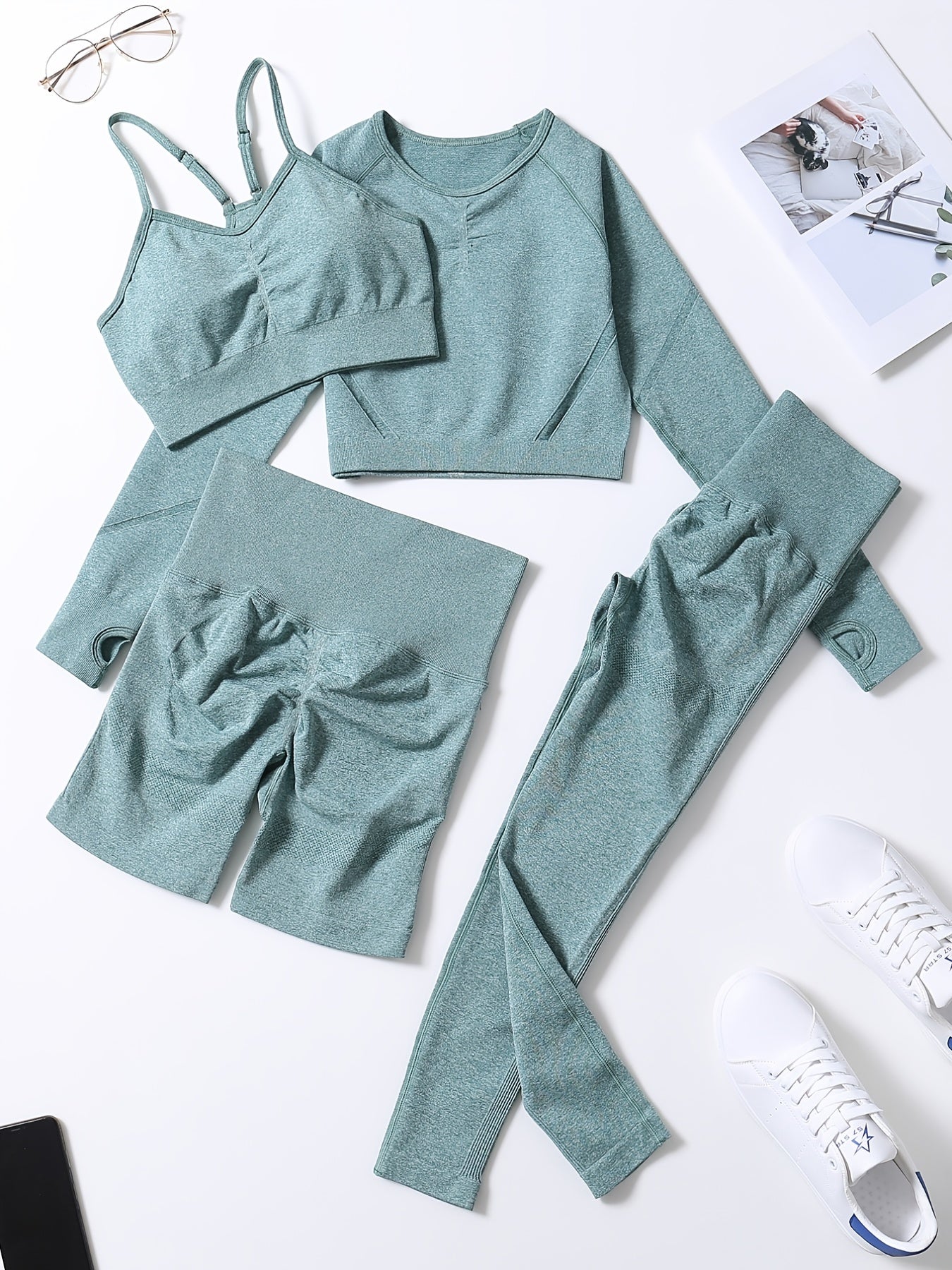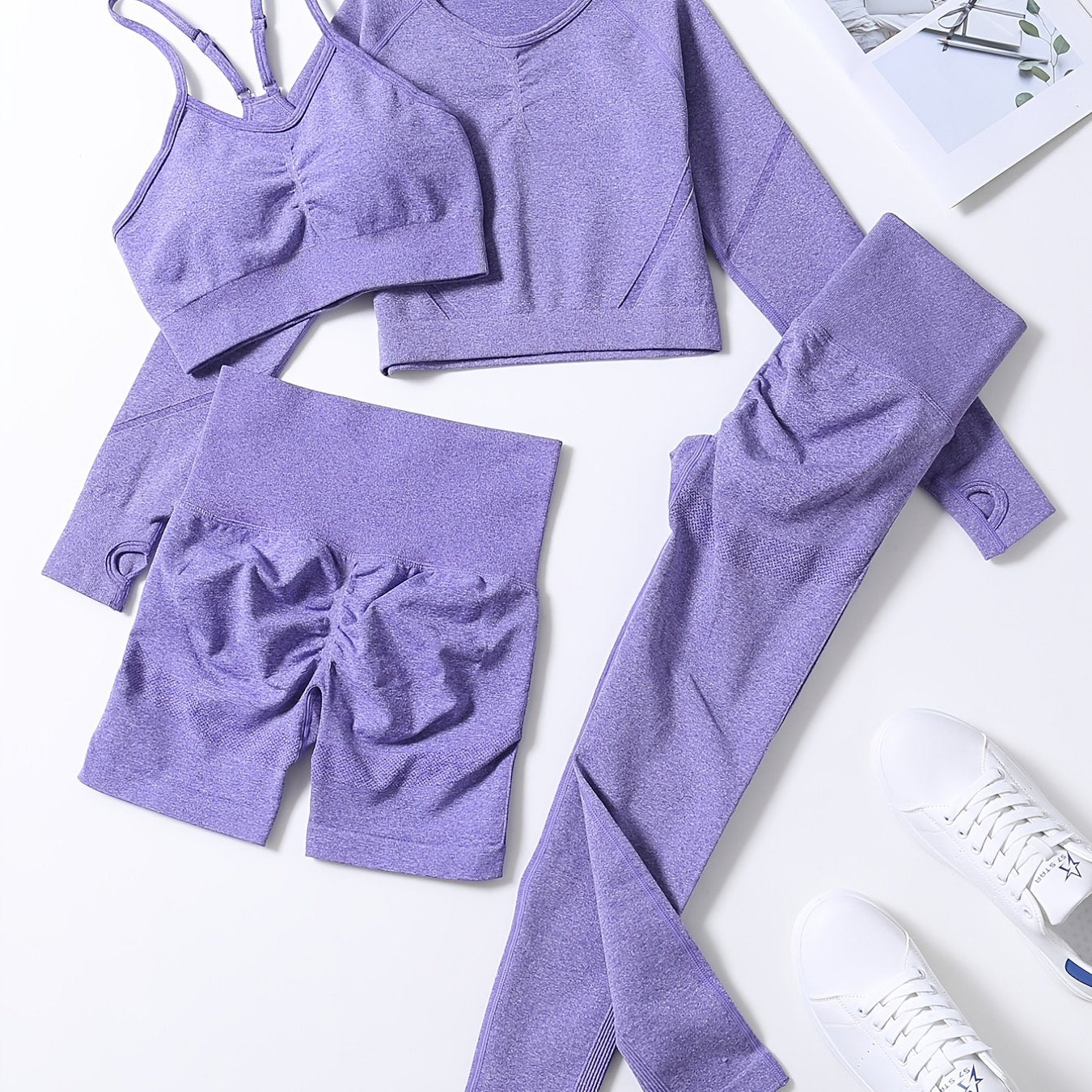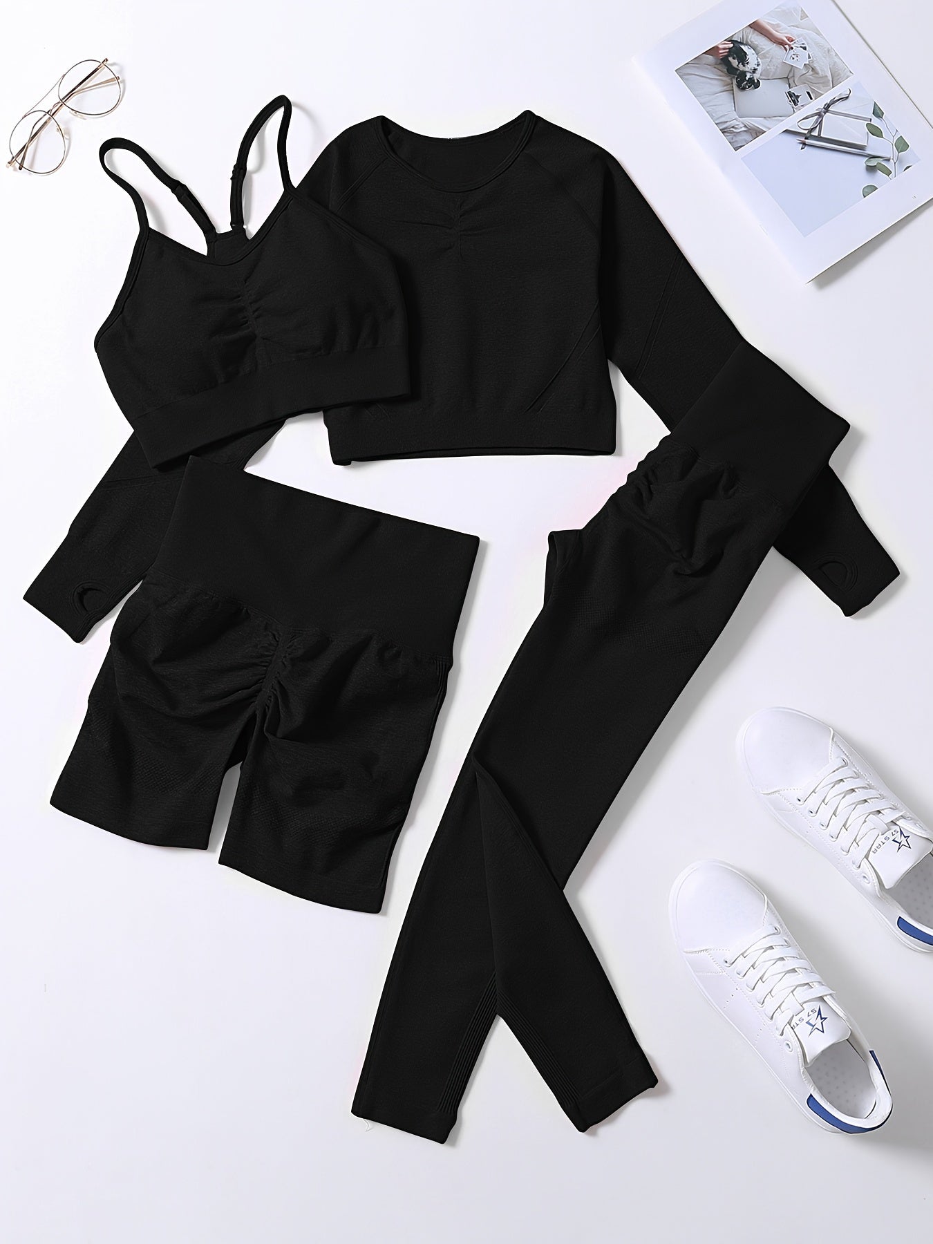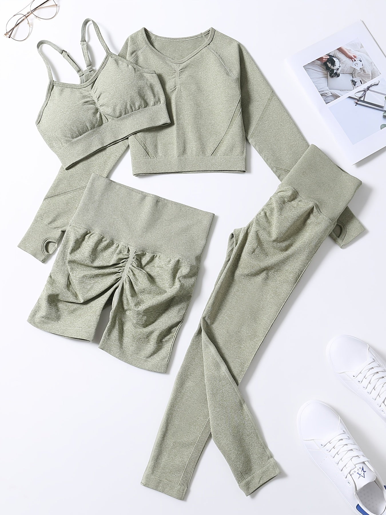 Smiling Face Style Workout Outfits for Women 4pcs Ribbed Seamless Crop Tank High Waist Yoga Leggings Sets