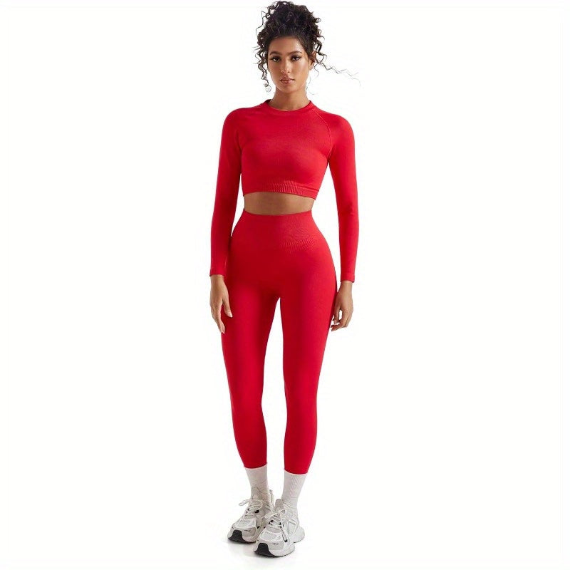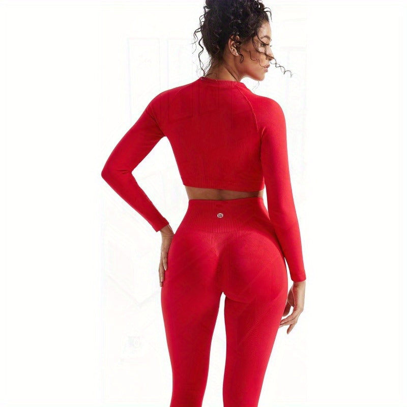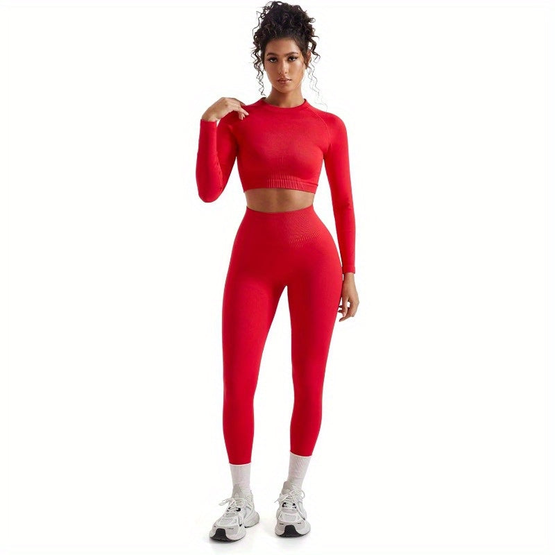 Women 2pcs Workout Sets Hidden Scrunch Hip Lifting Seamless Leggings Long Sleeve Yoga Crop Tops