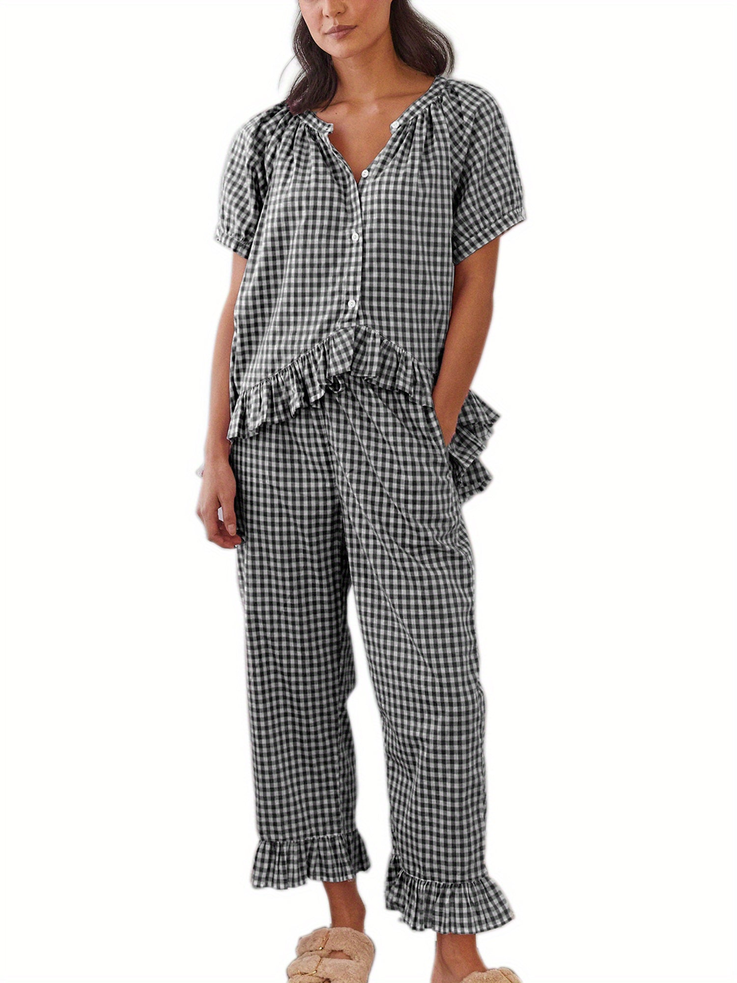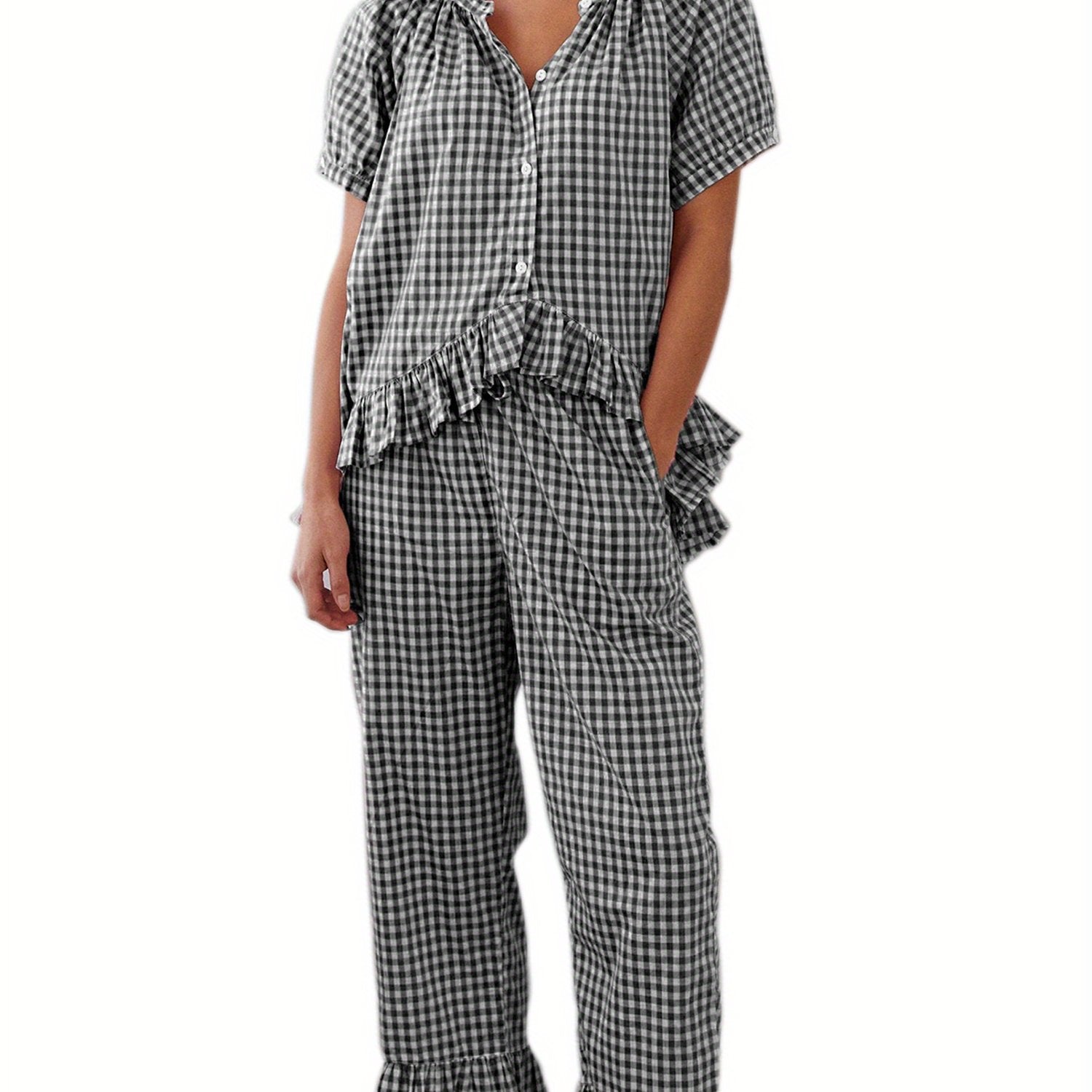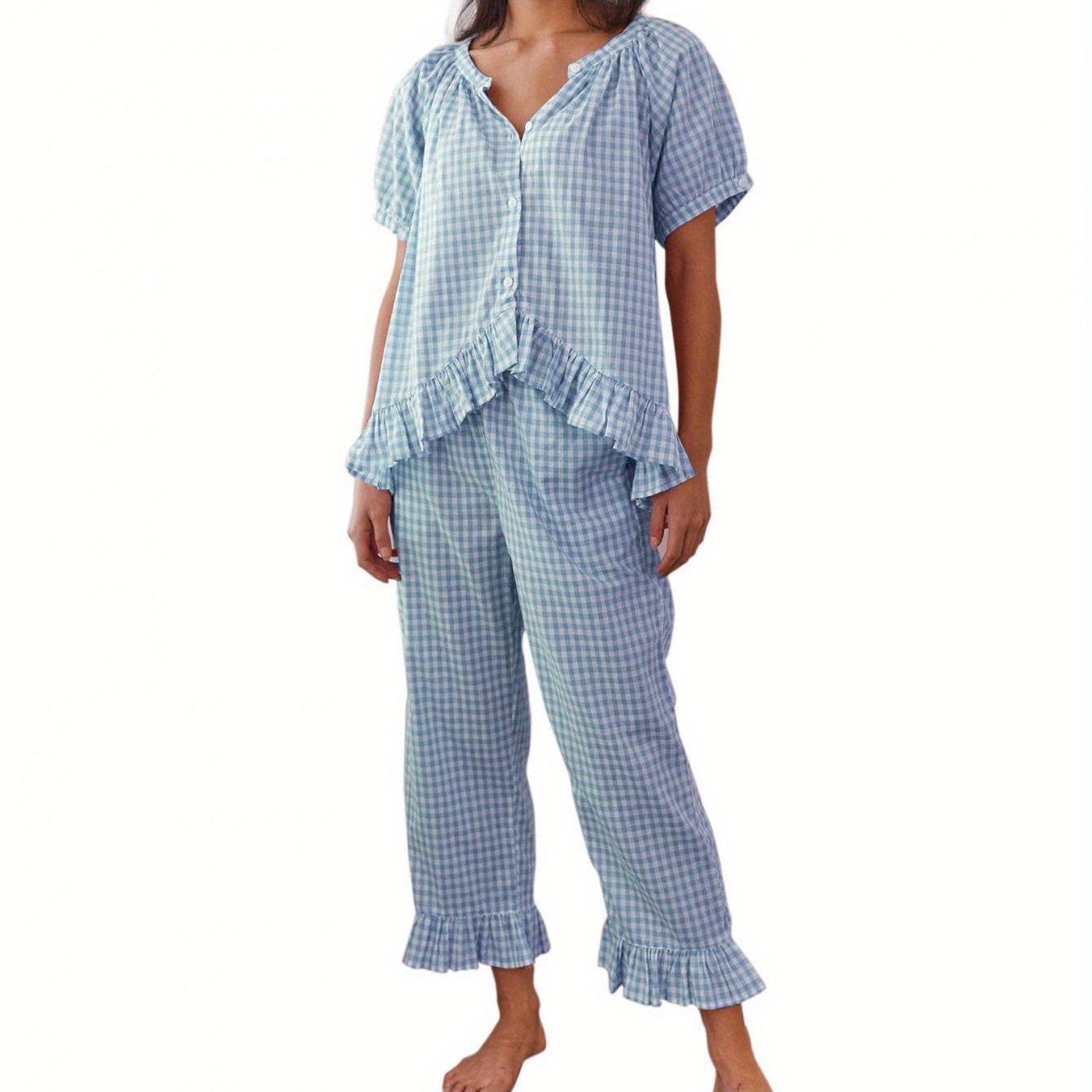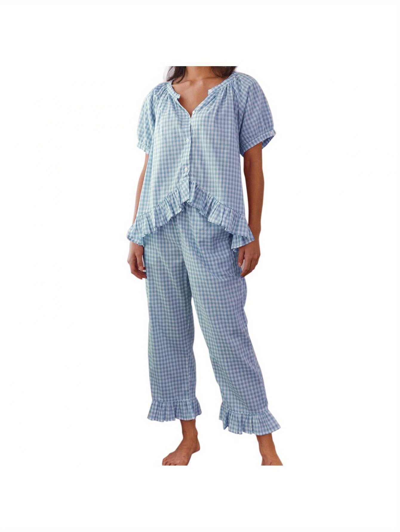 Womens 2pcs Pajama Set Short Sleeve Plaid Print Button Up Shirt + Ruffle Pants Set Sleepwear Loungewear