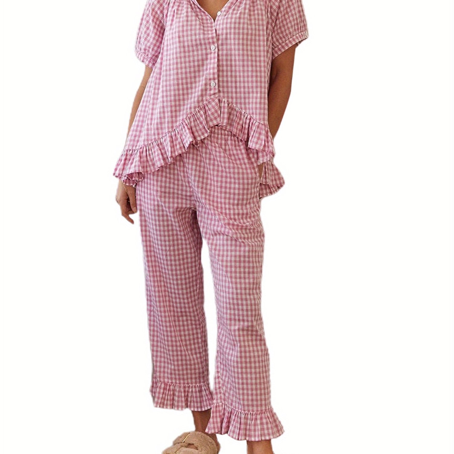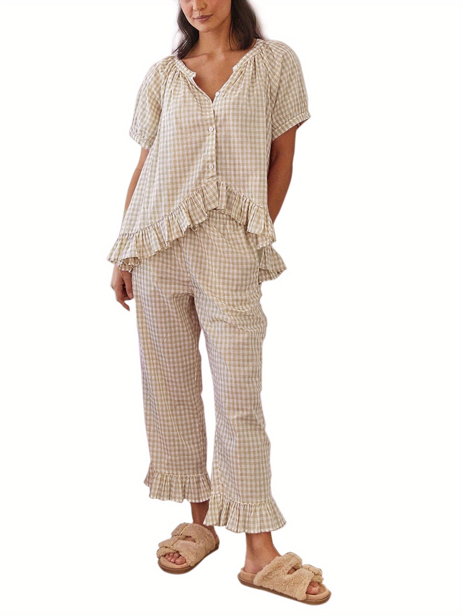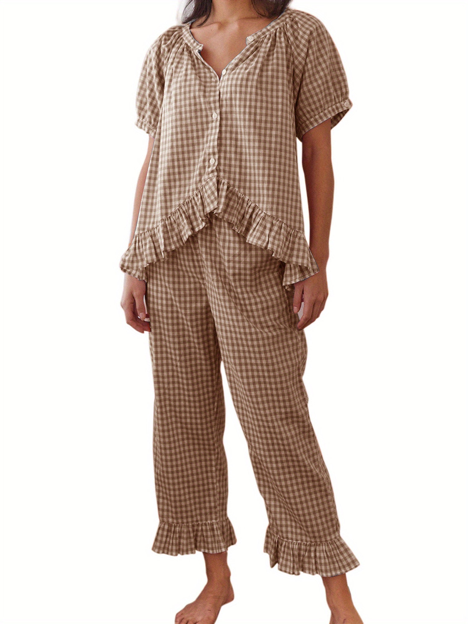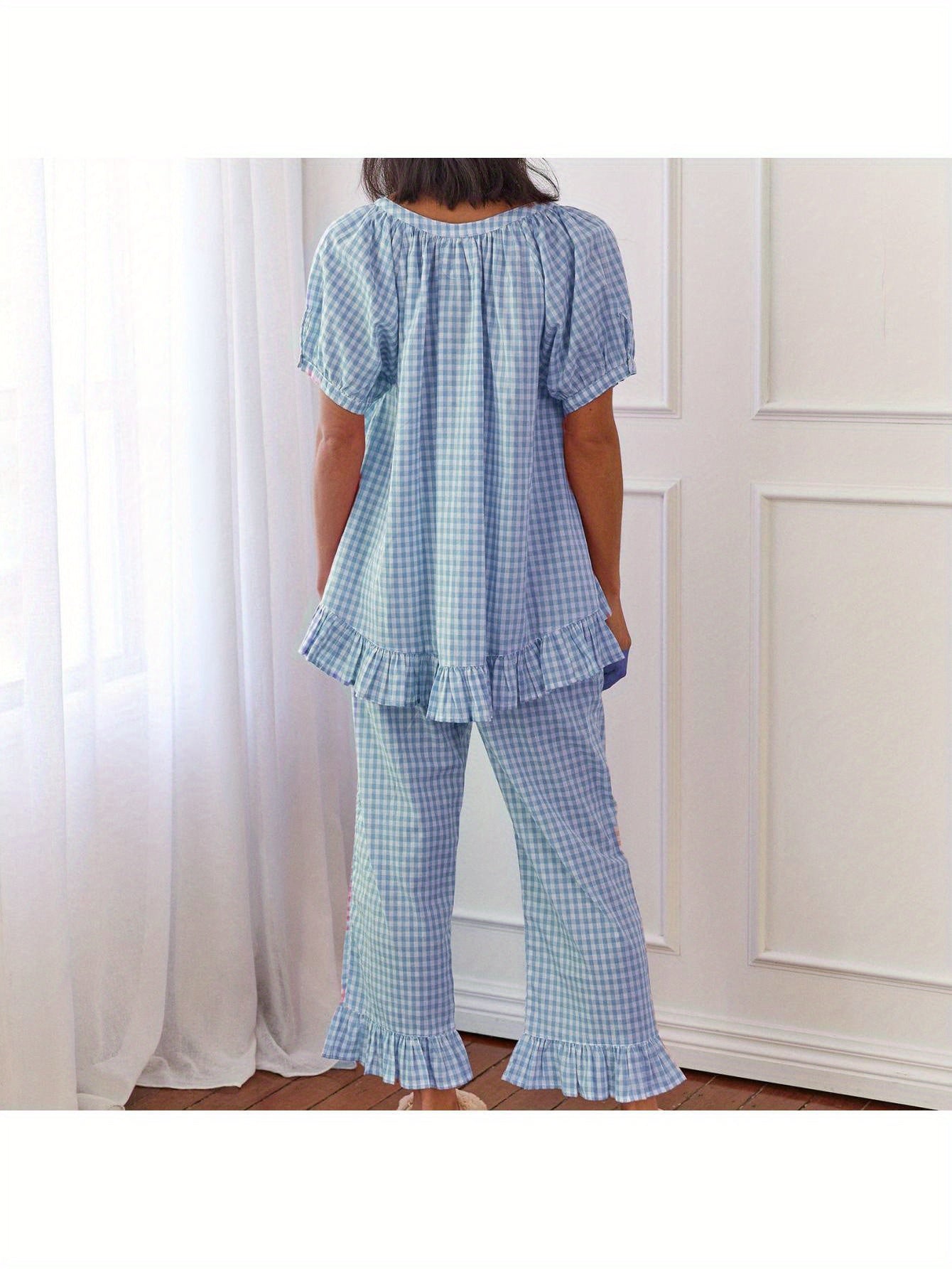 Womens 2pcs Pajama Set Short Sleeve Plaid Print Button Up Shirt + Ruffle Pants Set Sleepwear Loungewear