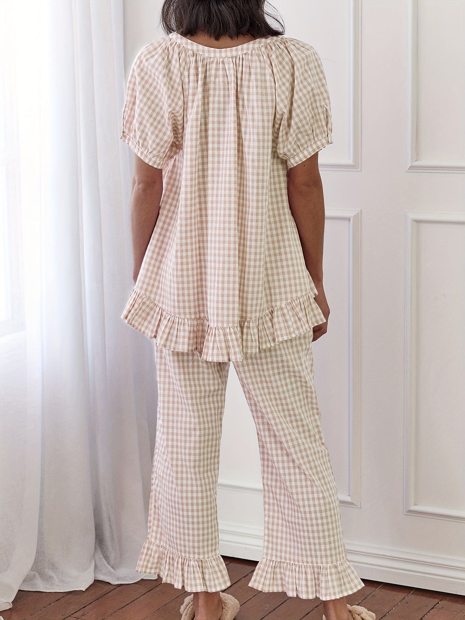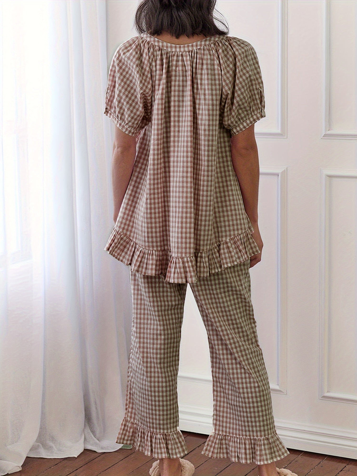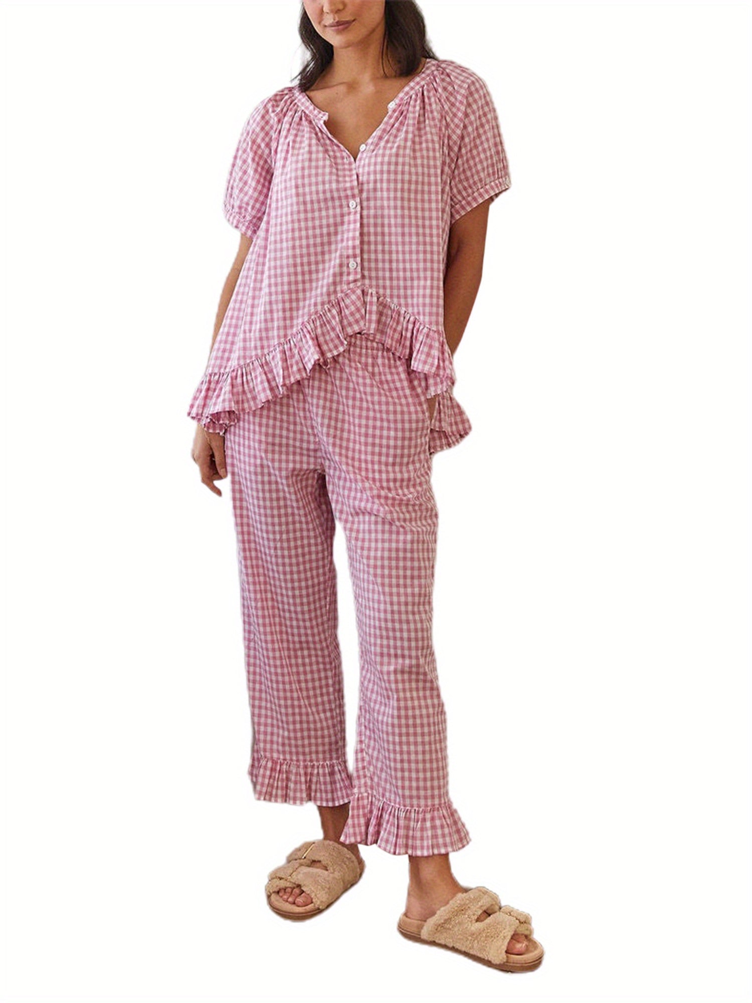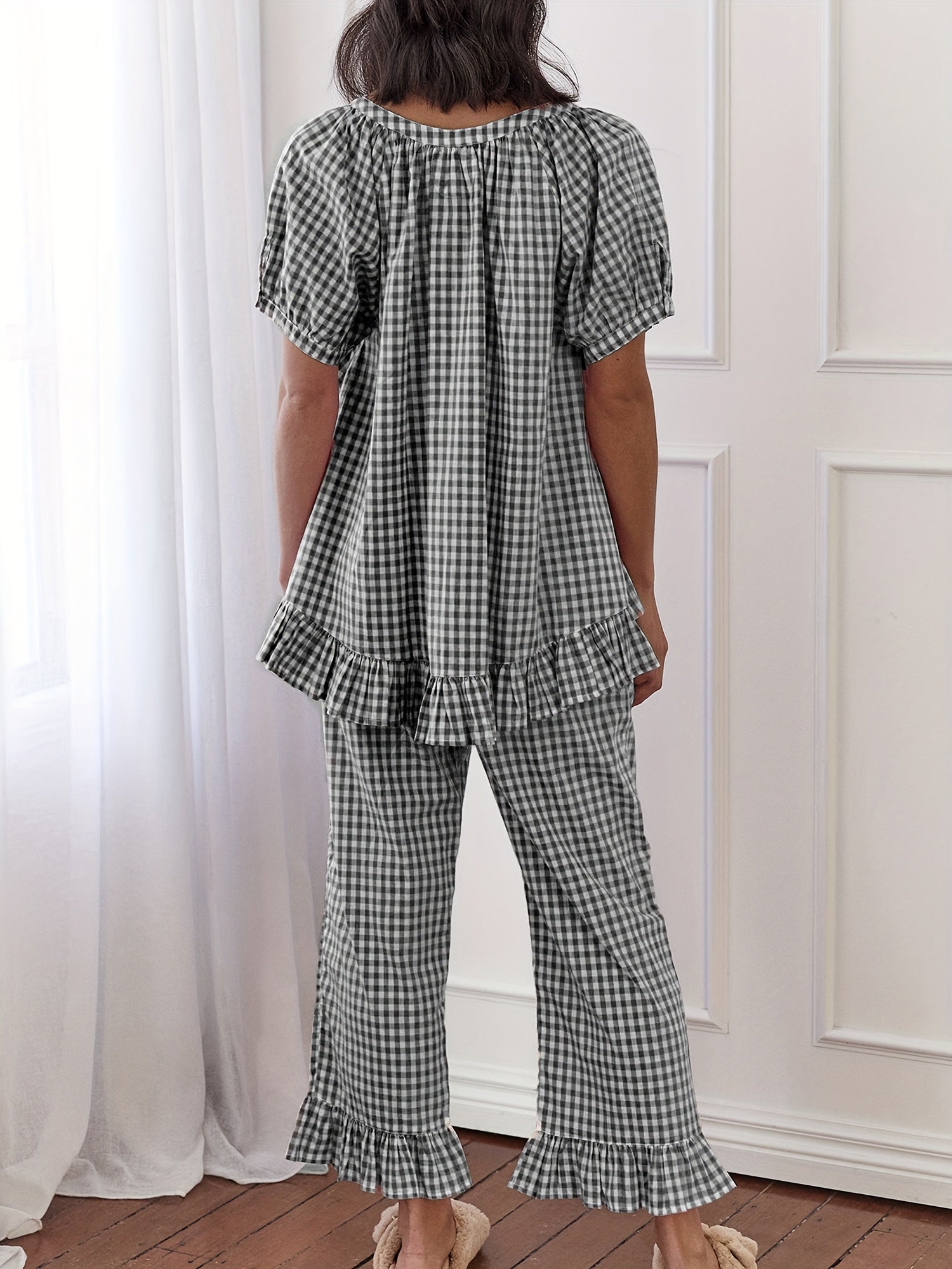 Womens 2pcs Pajama Set Short Sleeve Plaid Print Button Up Shirt + Ruffle Pants Set Sleepwear Loungewear