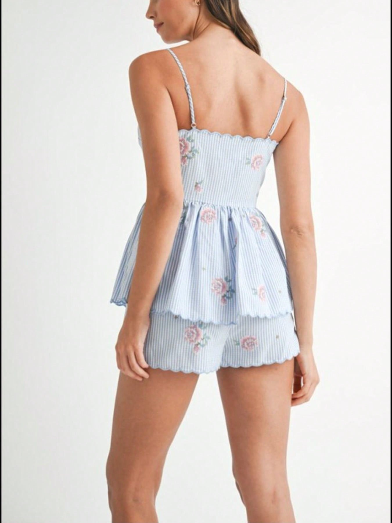 This charming set includes a stripe embroidered peplum cami and matching shorts. The cami features delicate embroidery for a touch of elegance. while the peplum design adds a flattering silhouette. Paired with the coordinating shorts. this set is perfect for a summery and stylish look for various occasions.