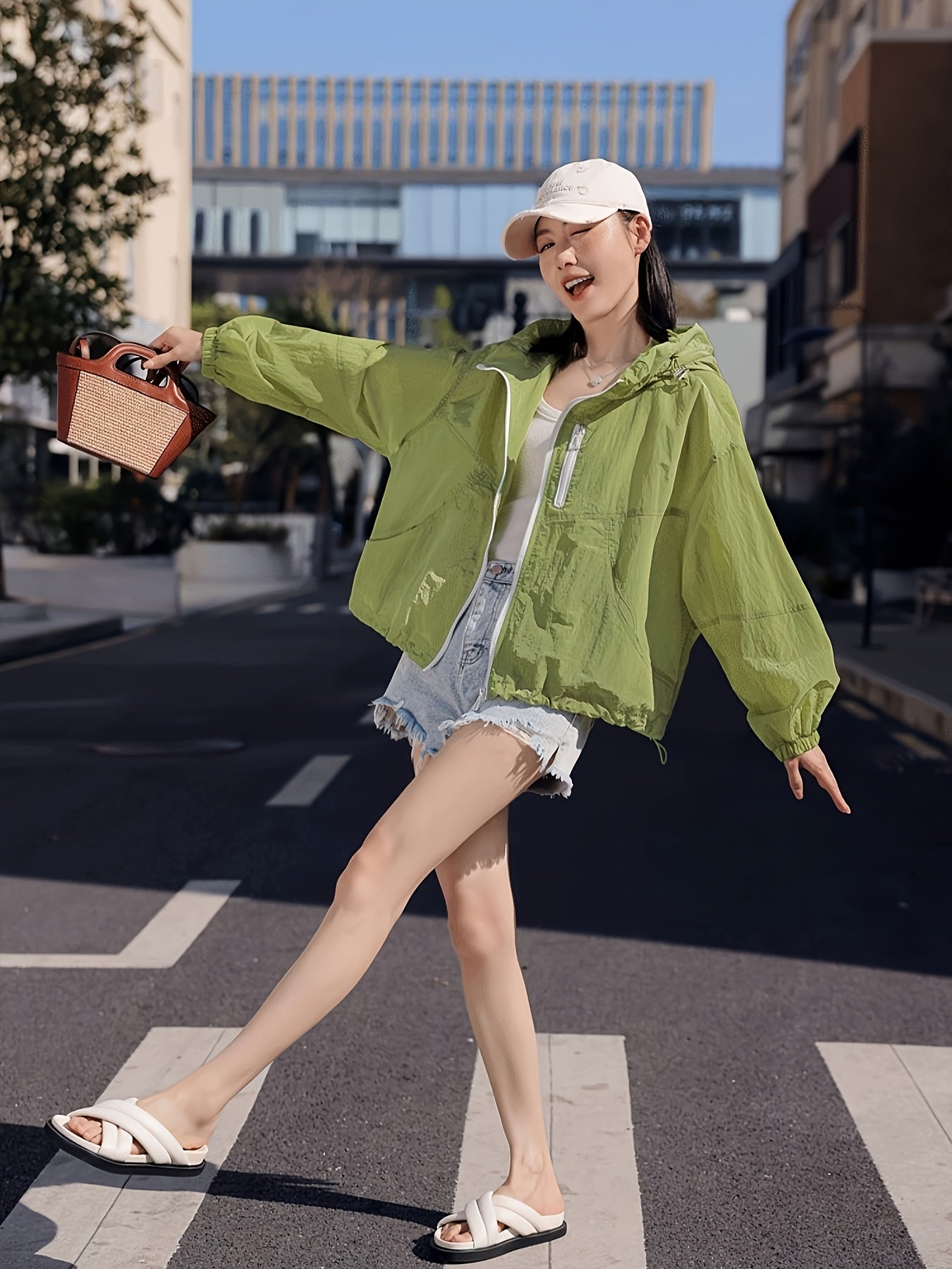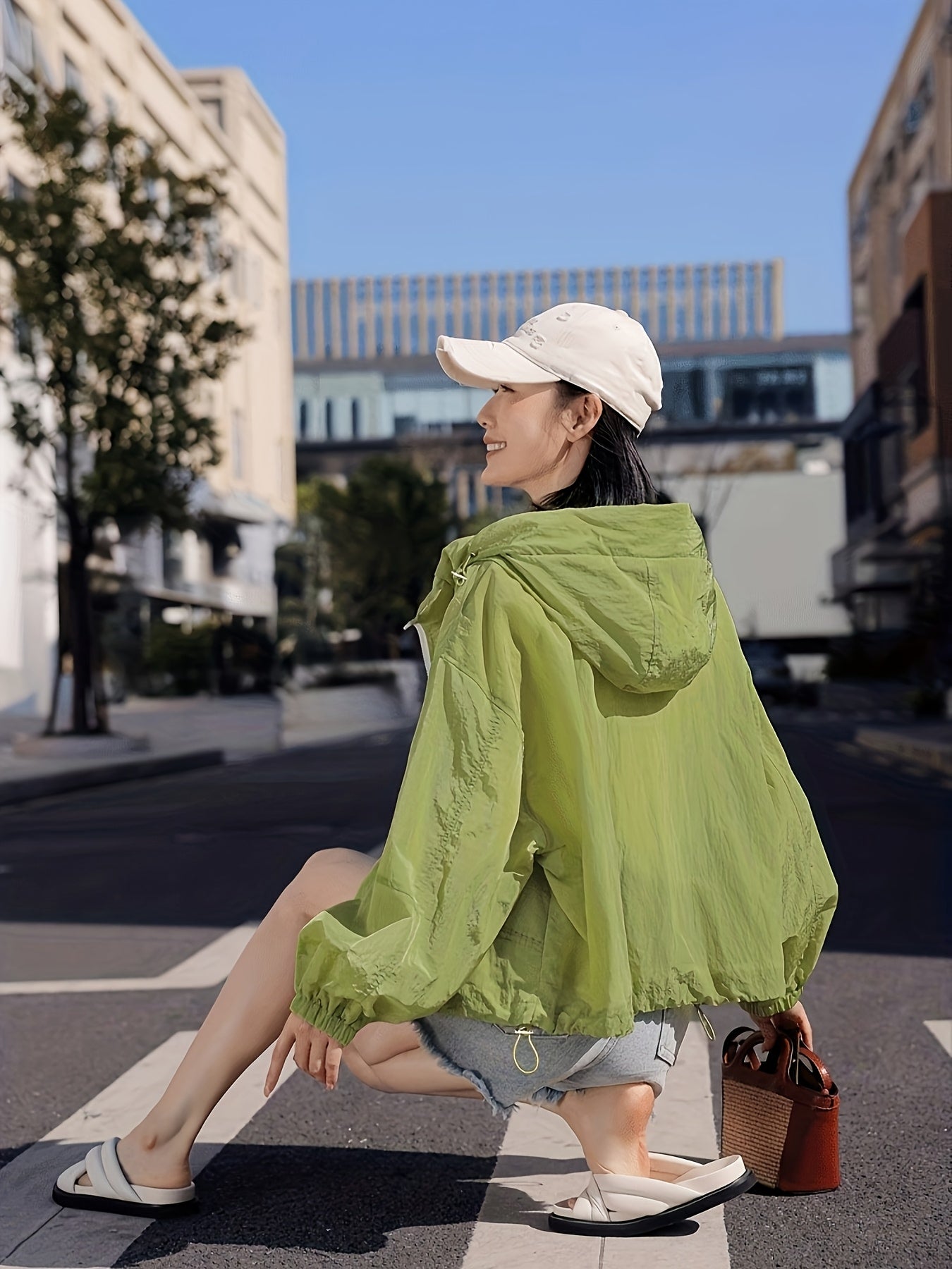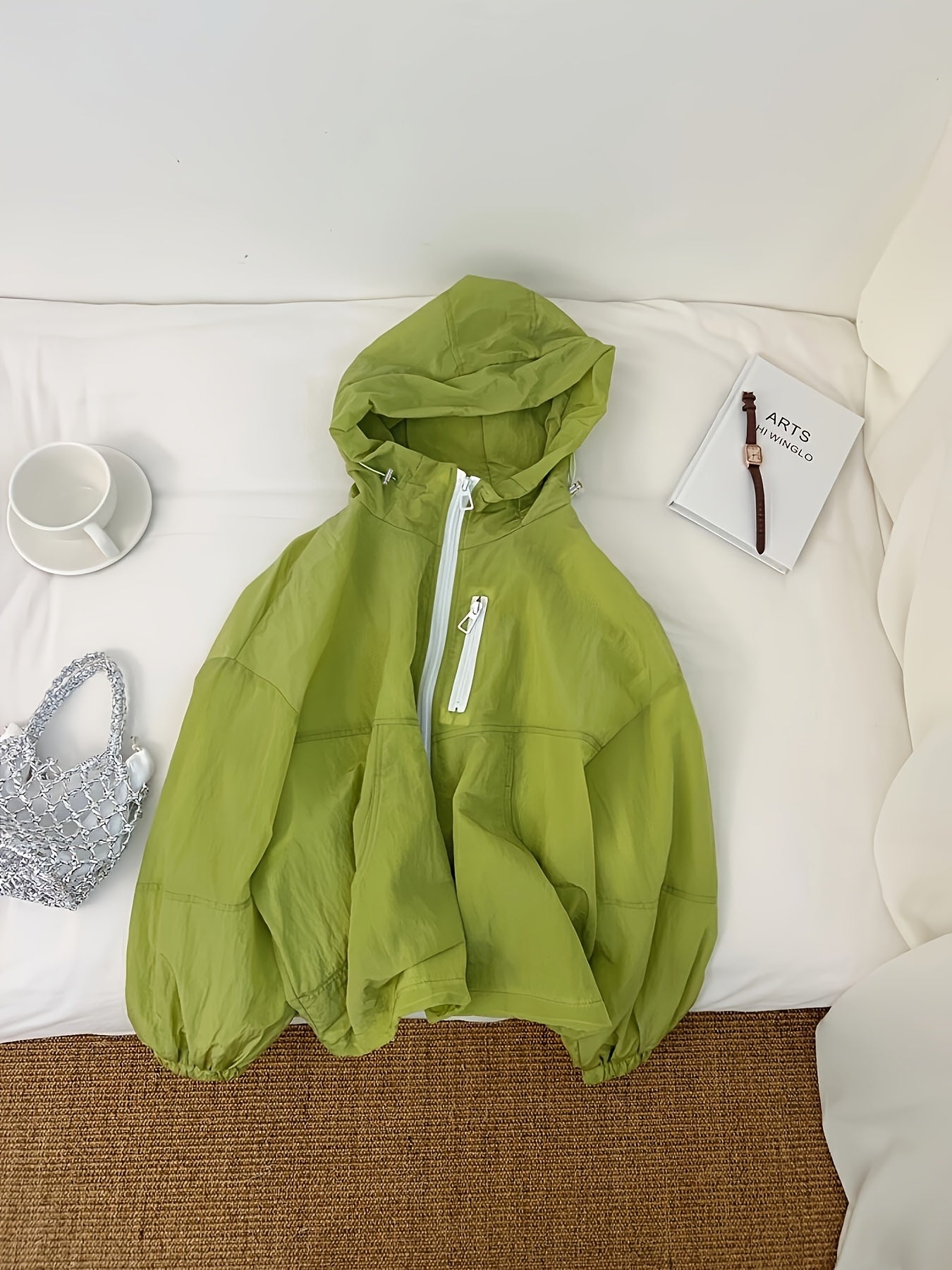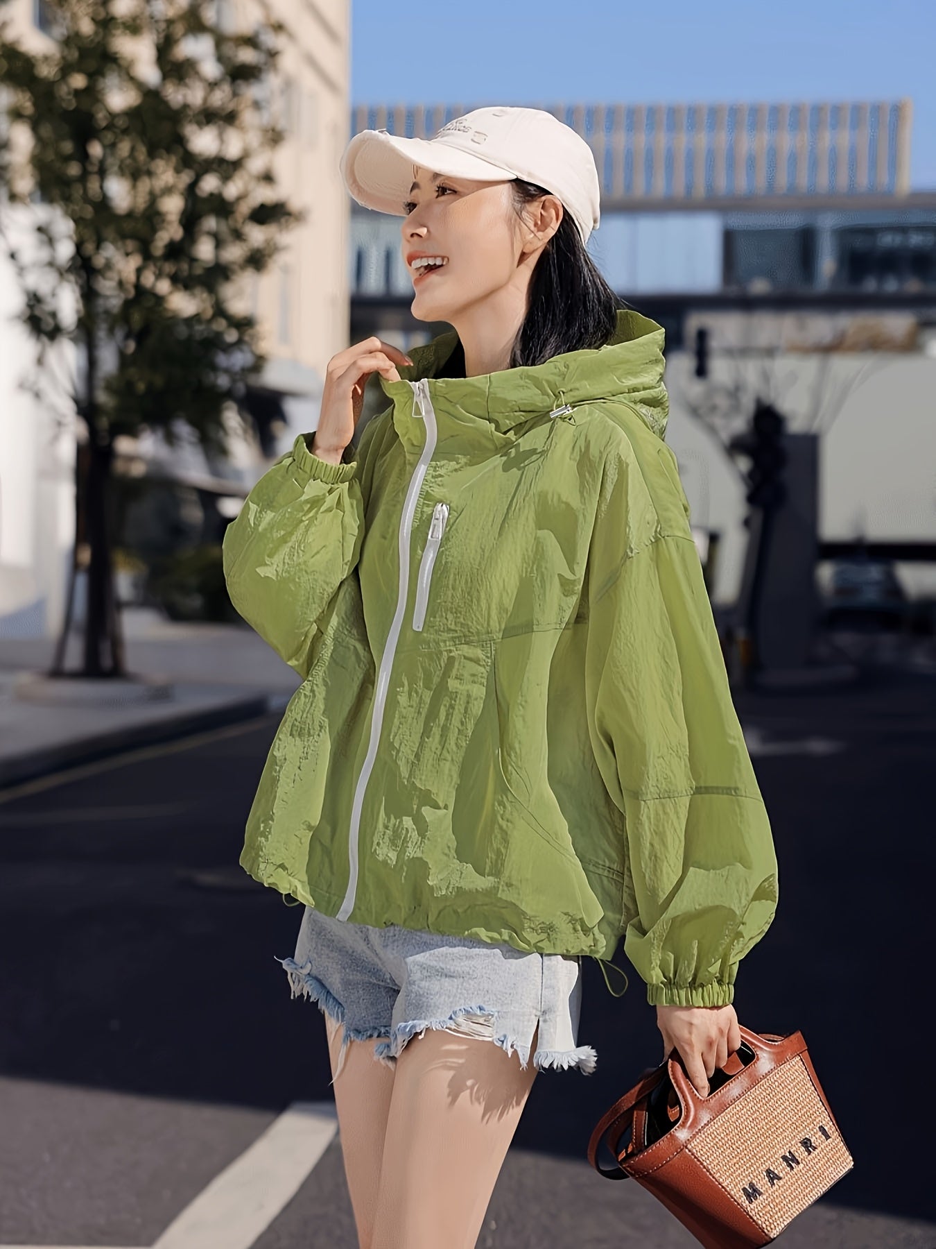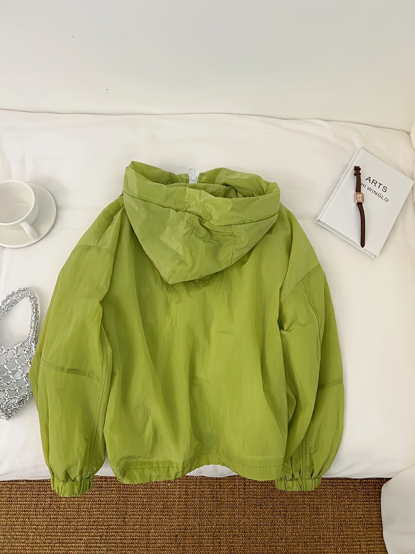Women's Lightweight Breathable Hooded Jacket - Spring Summer Casual Outdoor Coat with Zipper Closure, Durable Non-Stretch Fabric, Vibrant Green, Machine Washable, Hooded Sun Protective Jacket, Drop Shoulder Design
