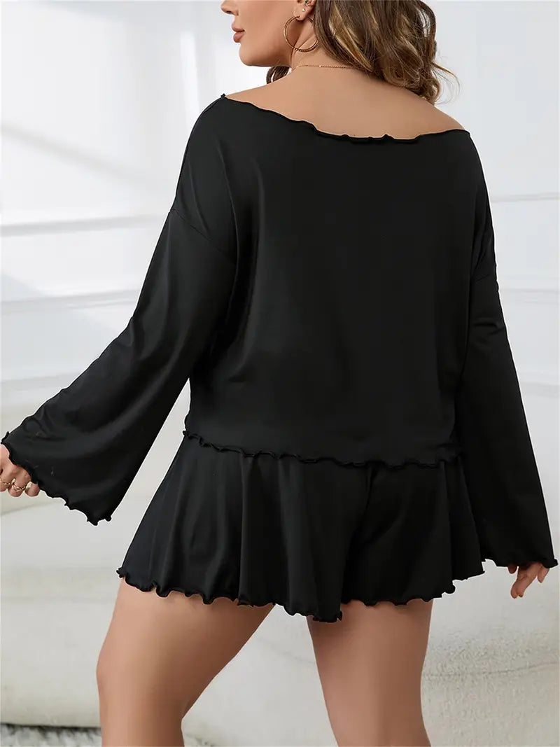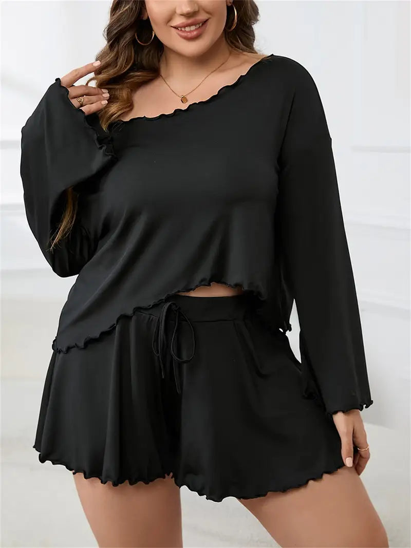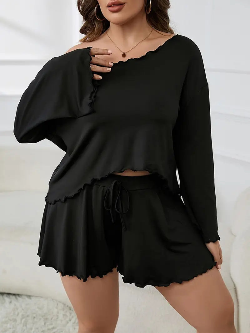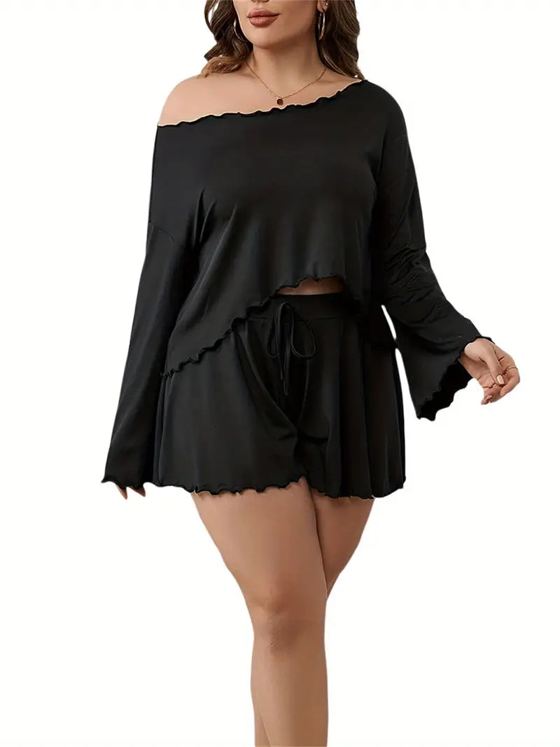 Women'S Plus Size Loungewear Set - Off-Shoulder Long Sleeve Top & Elastic Waist Shorts, Solid Black Casual Summer Sleepwear, Soft Polyester Blend