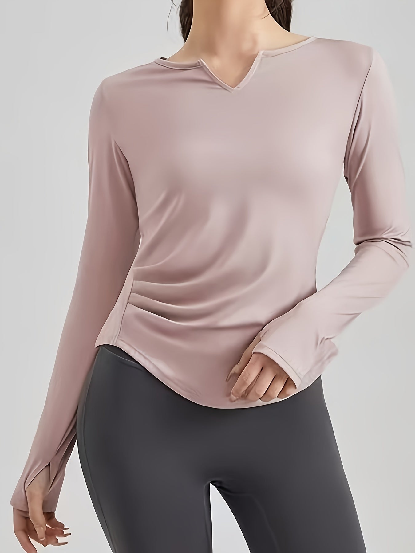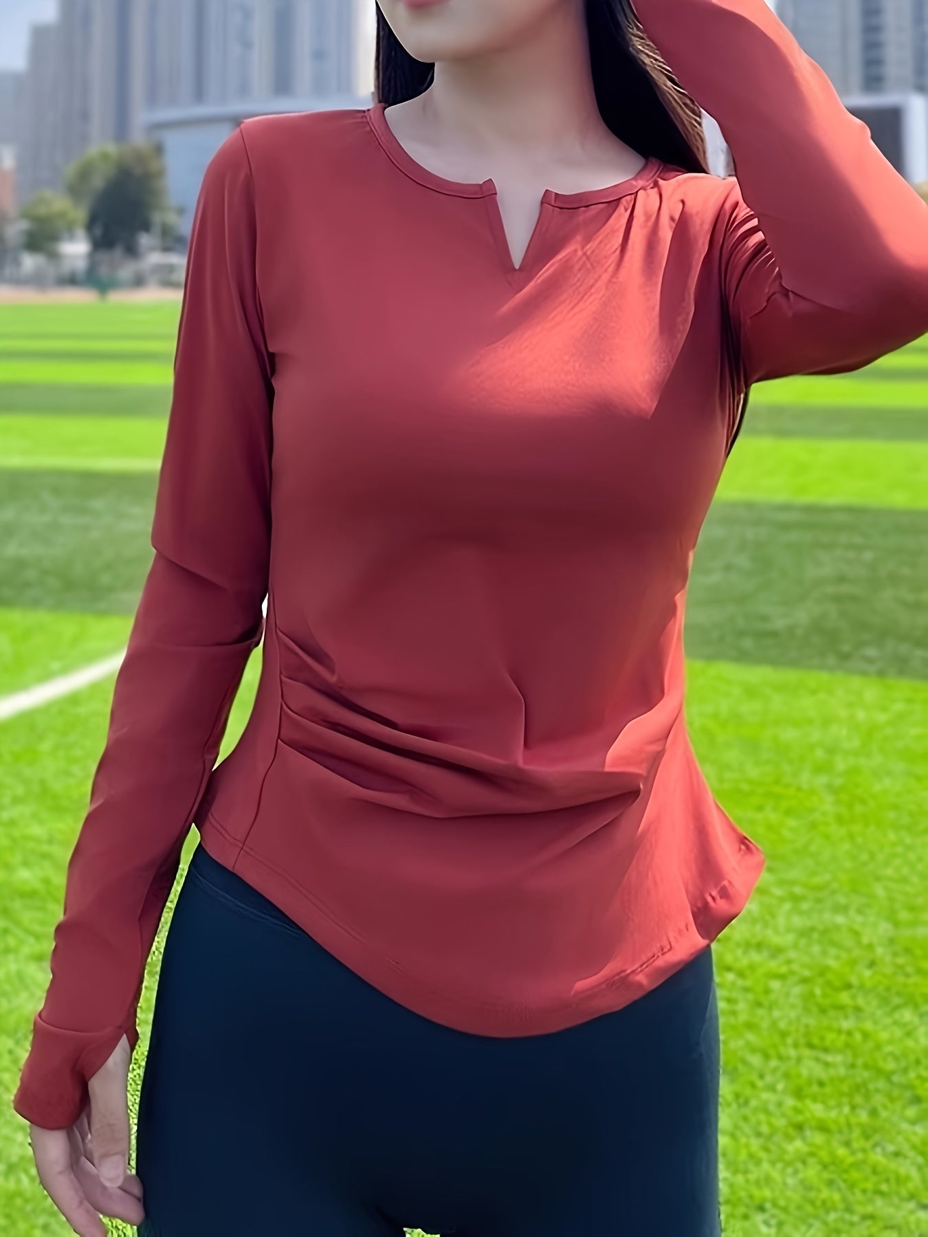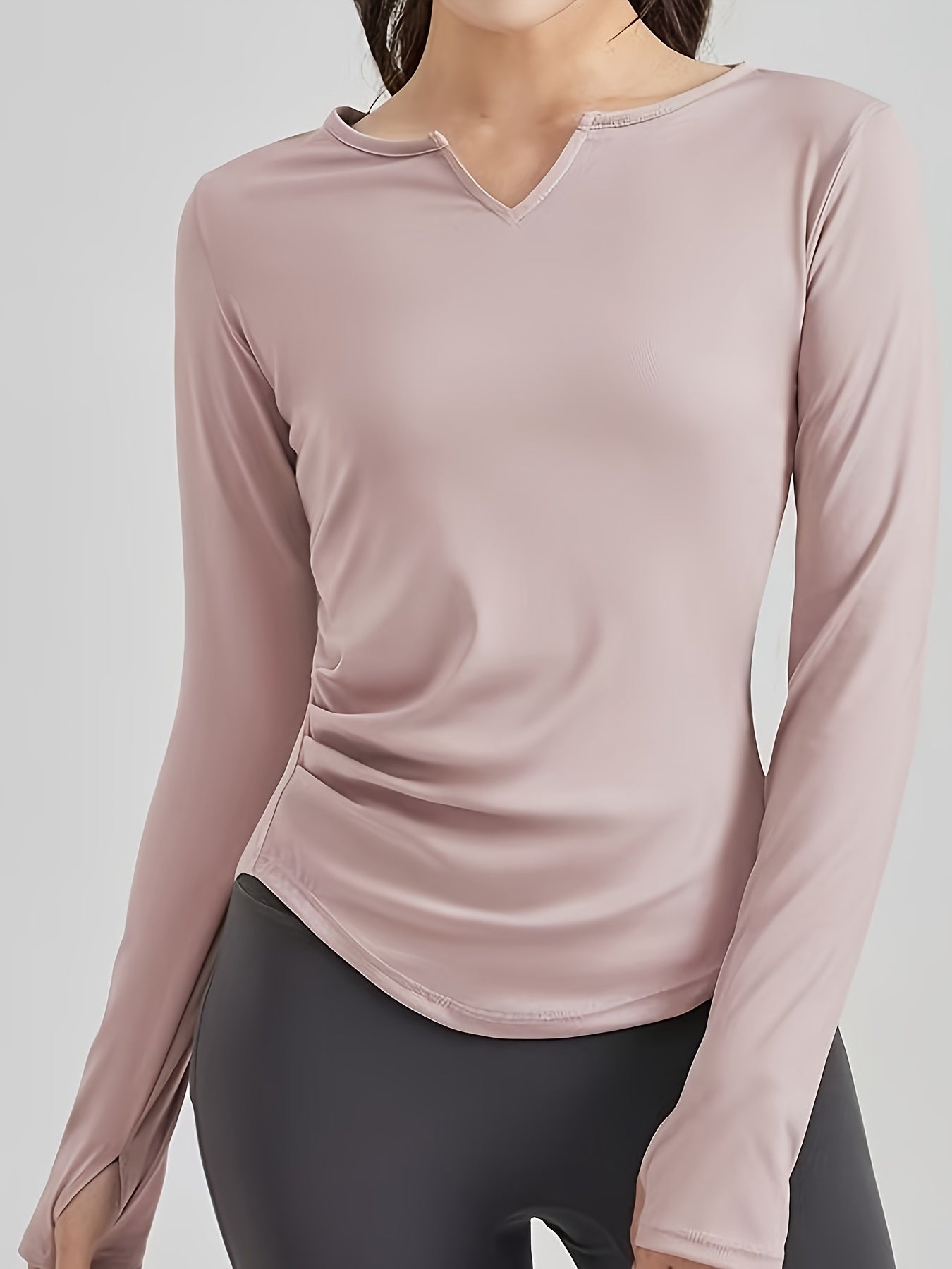 Women's Quick-Dry Sweat Absorbent Long Sleeve Workout Top - V-Neck Thumb Button Yoga Shirt with Ruching Detail, Slim Fit for Pilates, Running & Training, All-Season Machine Washable Fitness Apparel, Athletic Vneckline, Ruched Sportswear, Stretchy Fabric