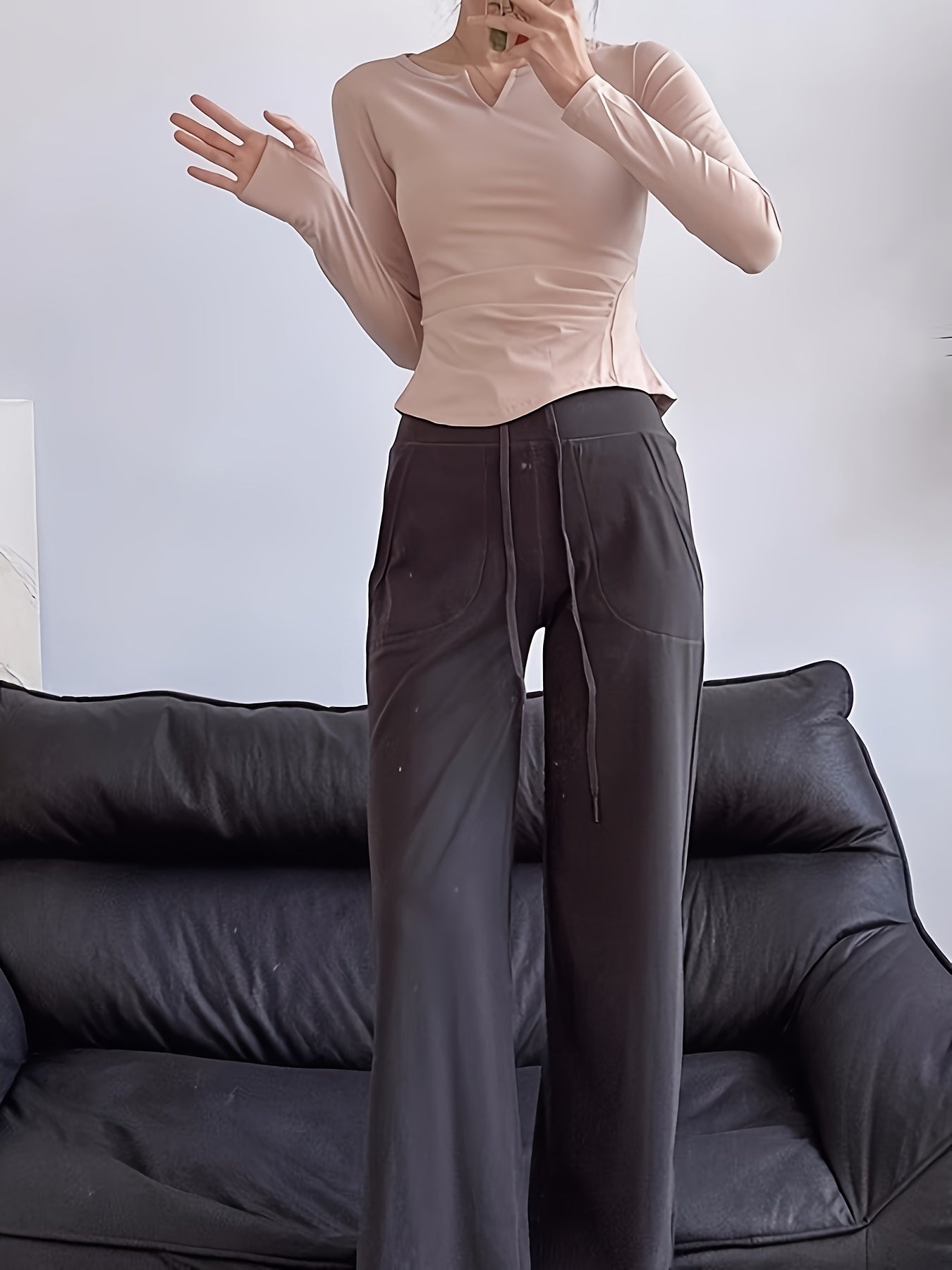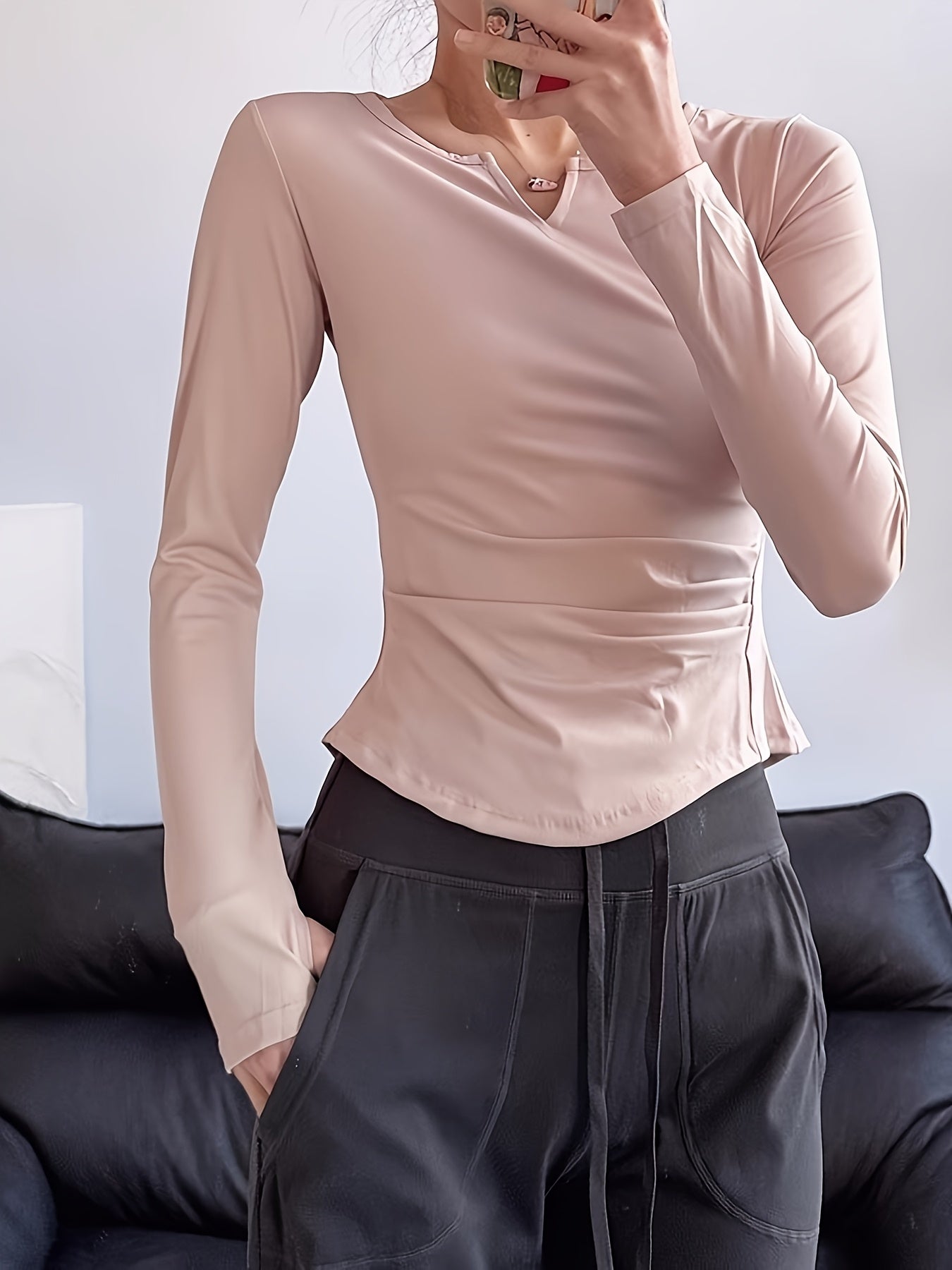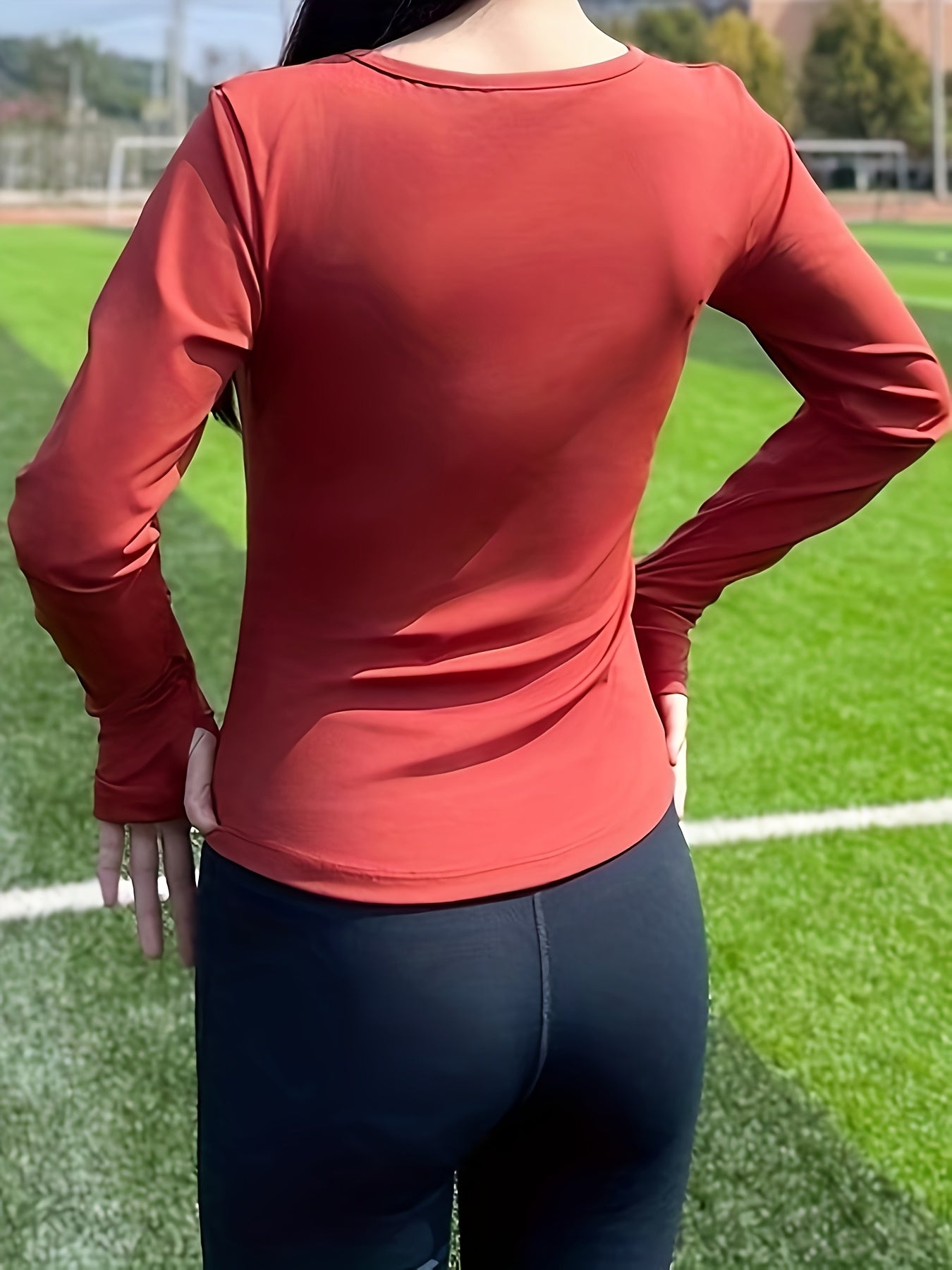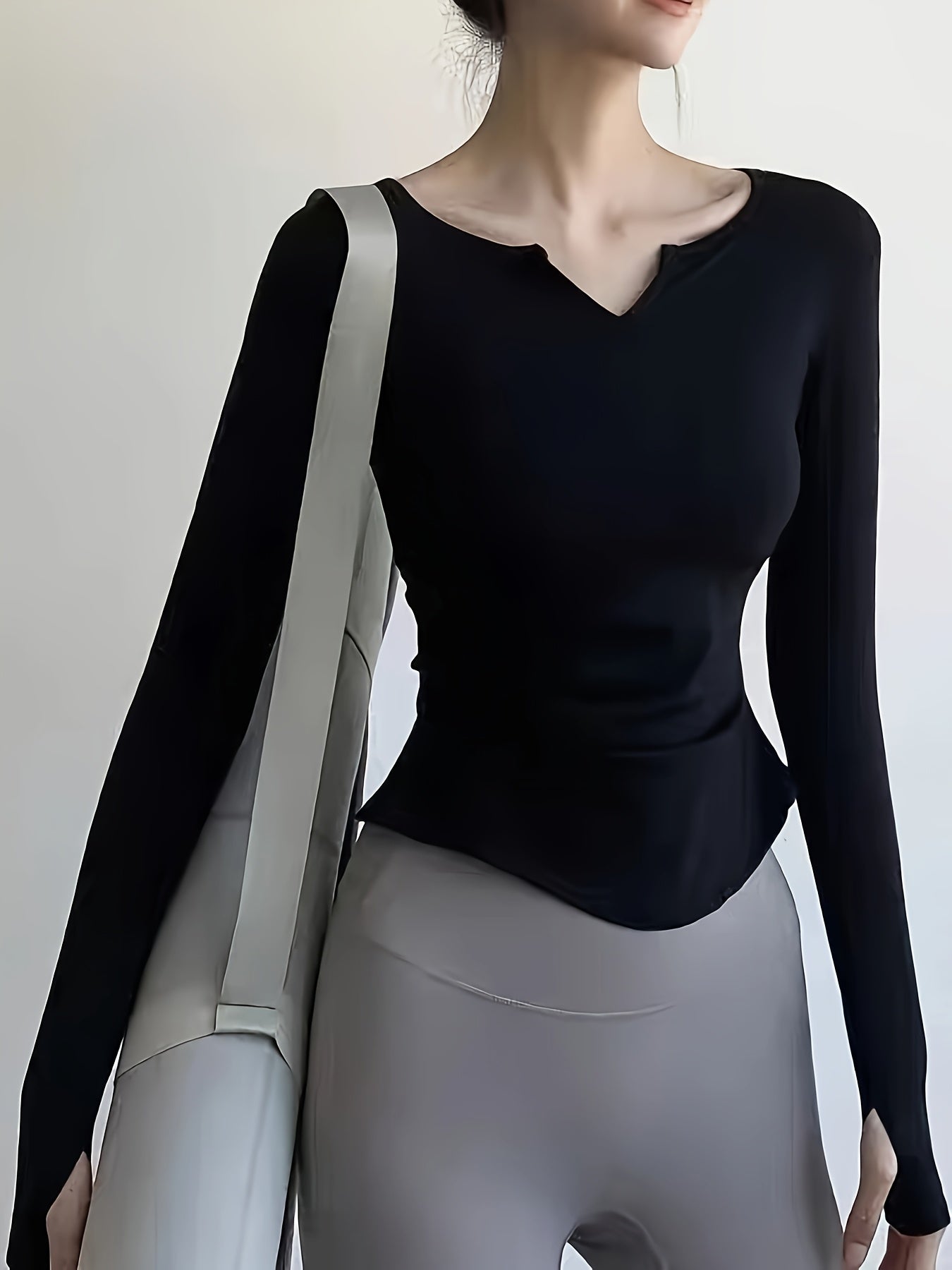 Women's Quick-Dry Sweat Absorbent Long Sleeve Workout Top - V-Neck Thumb Button Yoga Shirt with Ruching Detail, Slim Fit for Pilates, Running & Training, All-Season Machine Washable Fitness Apparel, Athletic Vneckline, Ruched Sportswear, Stretchy Fabric